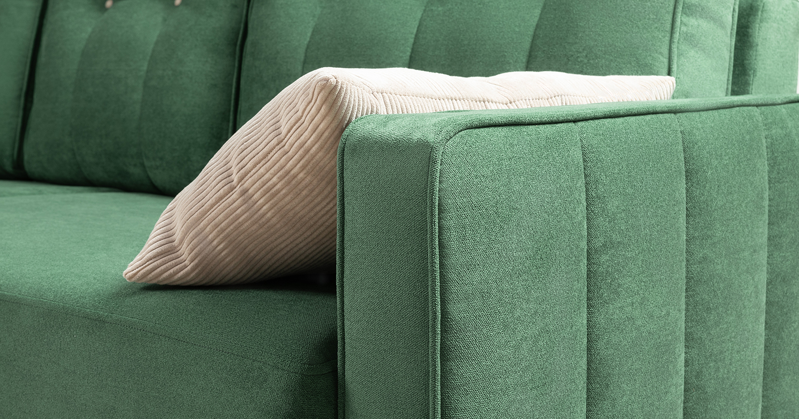 Диван-кровать угловой Арно ТД 566 велюр Лаки 20 хвойный зеленый, Vertical 910 молочно-серый, сборка на любую сторону
