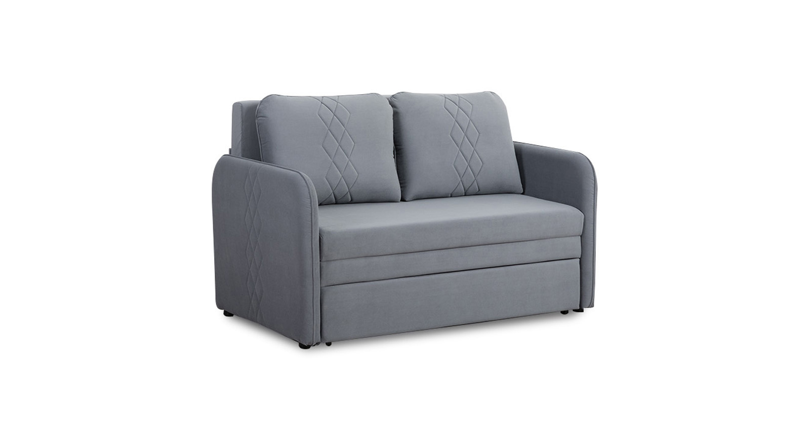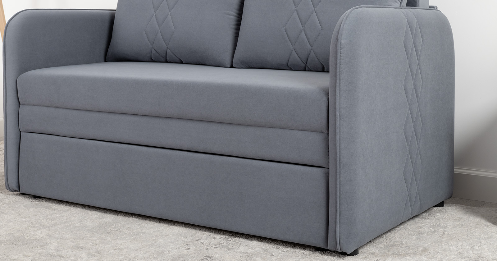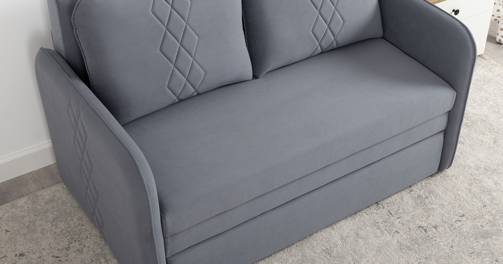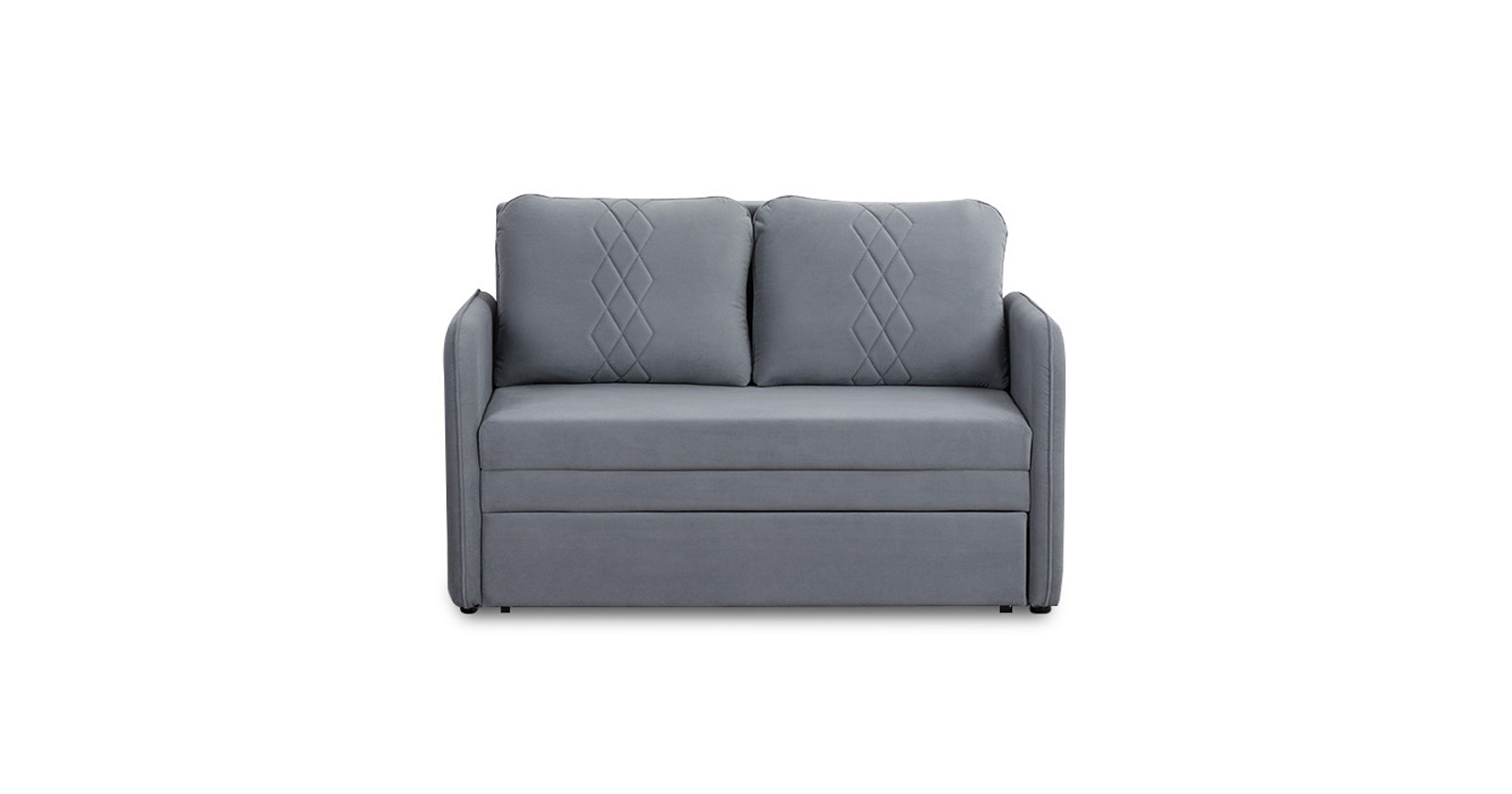 Стильный компактный диван для детской и гостиной. При своих скромных размерах он трансформируется в полноценное спальное место для детей и подростков. Лаконичный дизайн в виде декоративной стежки подчеркивает фактуру велюра, а небольшие размеры позволят разместить его в любом пространстве.