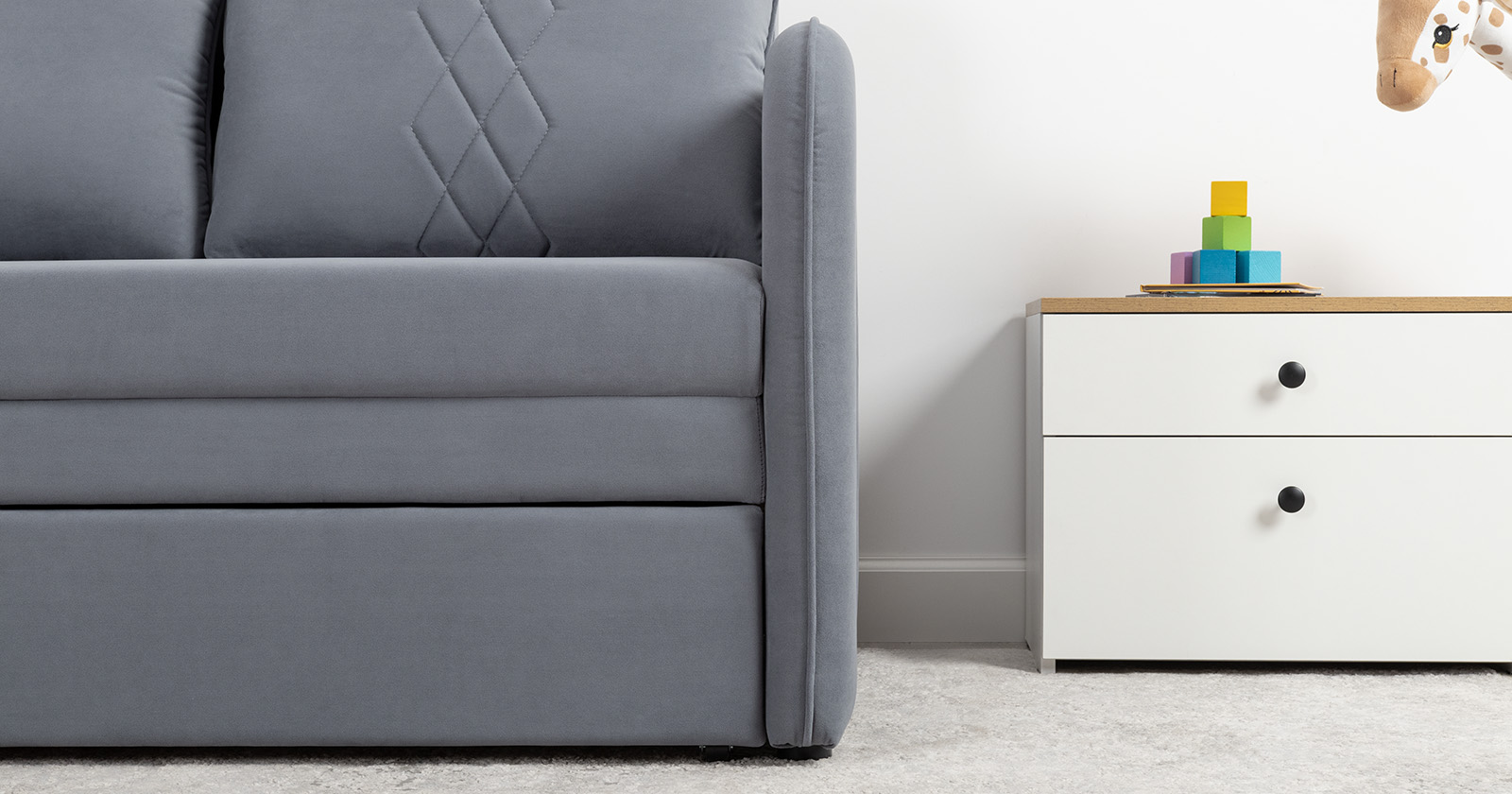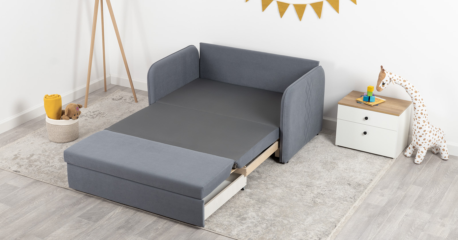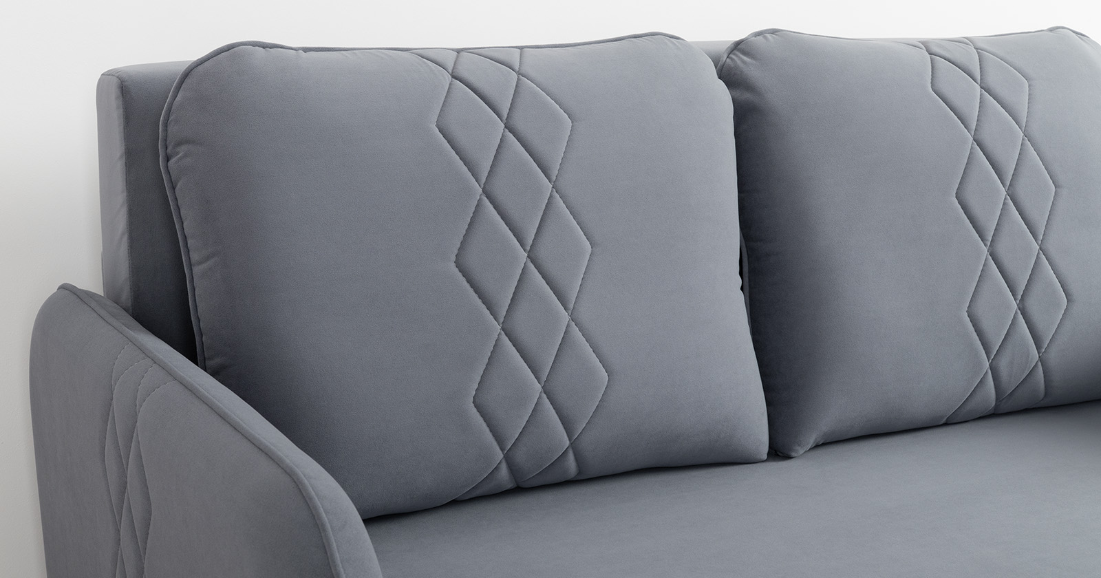 Стильный компактный диван для детской и гостиной. При своих скромных размерах он трансформируется в полноценное спальное место для детей и подростков. Лаконичный дизайн в виде декоративной стежки подчеркивает фактуру велюра, а небольшие размеры позволят разместить его в любом пространстве.