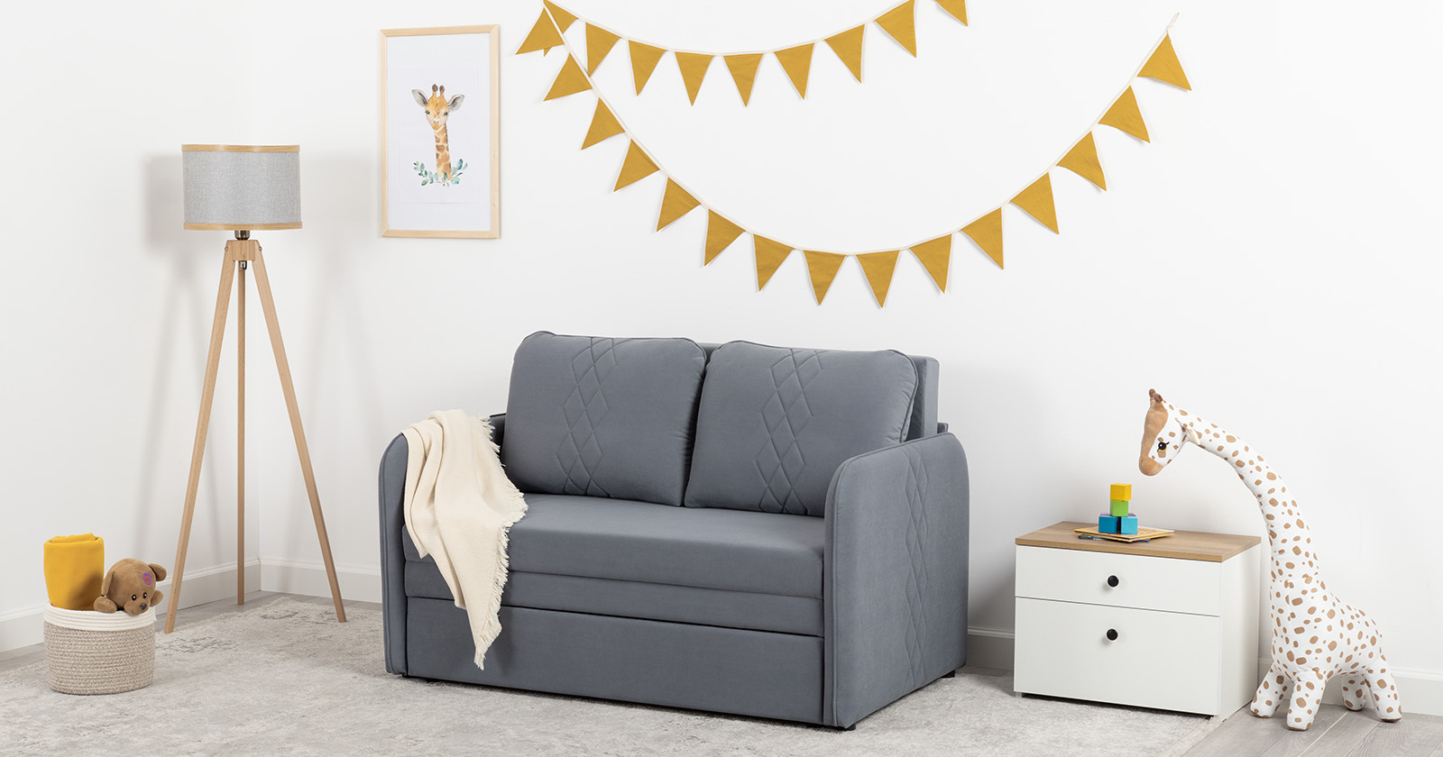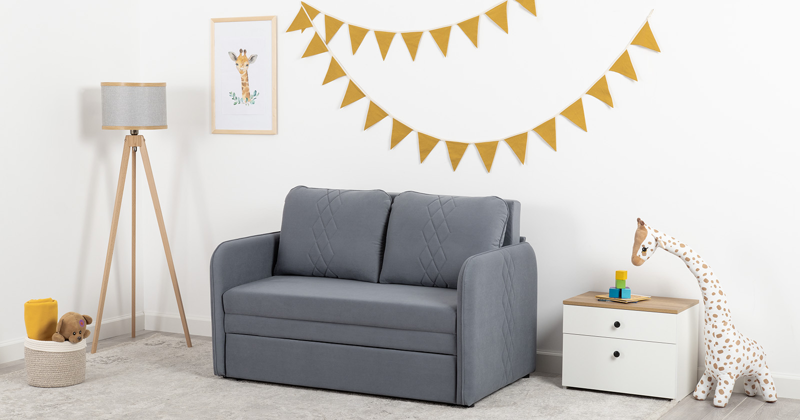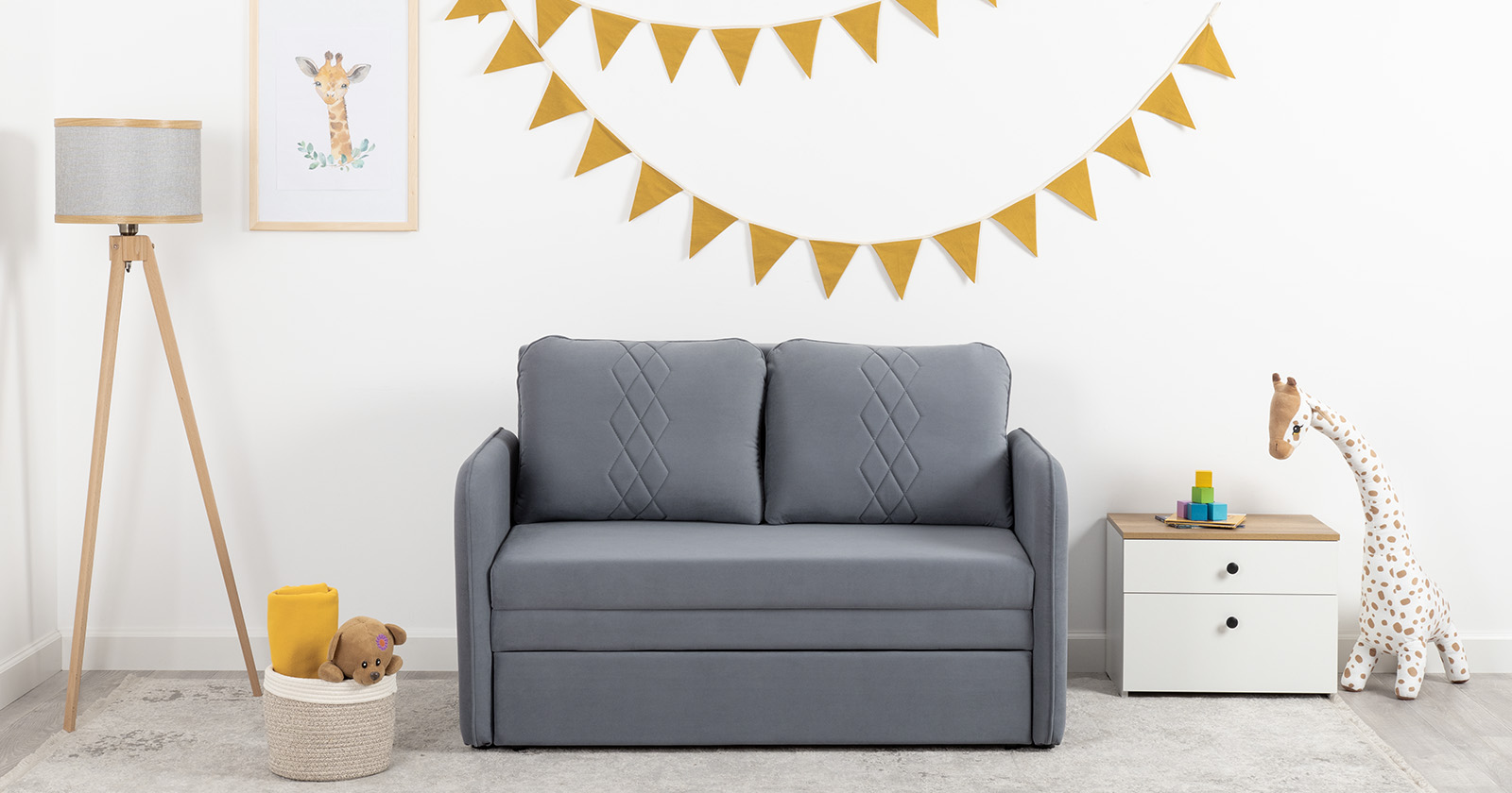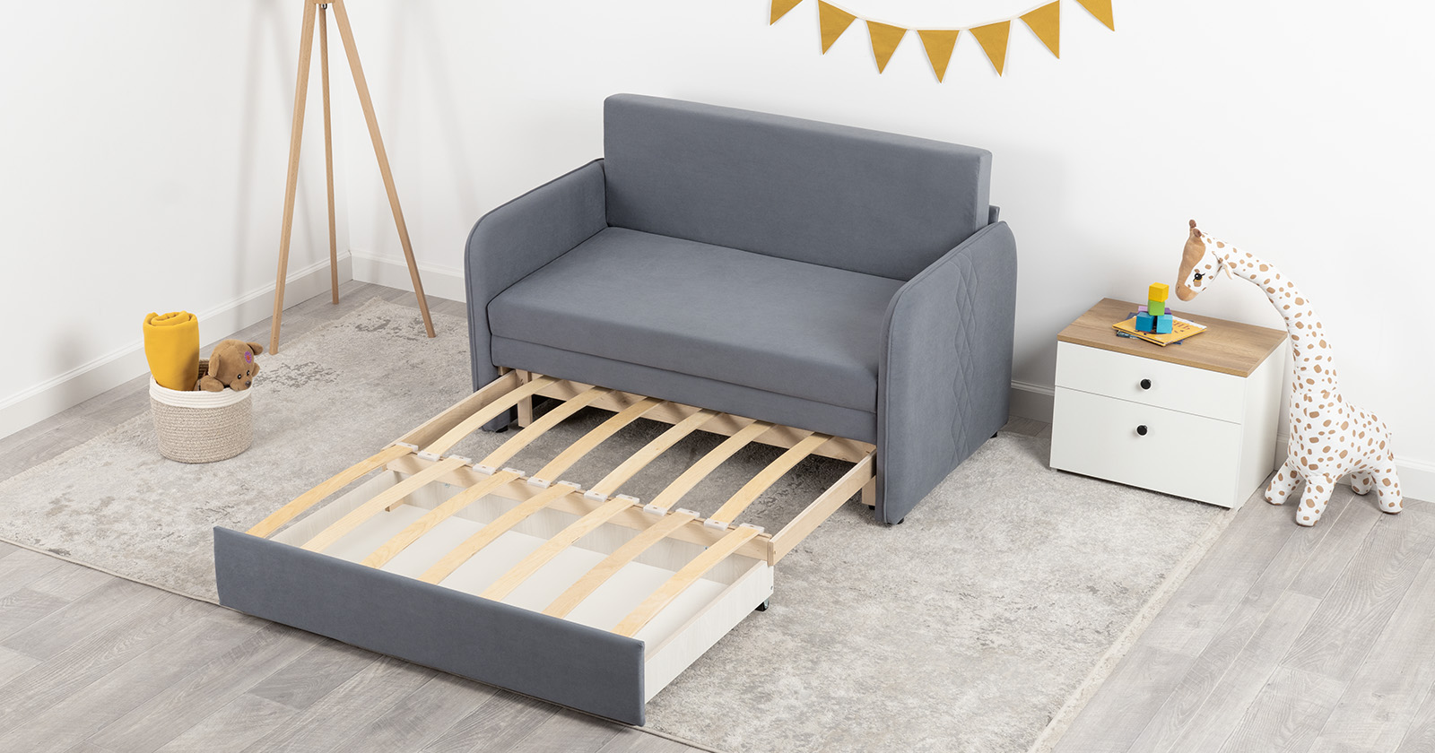 Стильный компактный диван для детской и гостиной. При своих скромных размерах он трансформируется в полноценное спальное место для детей и подростков. Лаконичный дизайн в виде декоративной стежки подчеркивает фактуру велюра, а небольшие размеры позволят разместить его в любом пространстве.