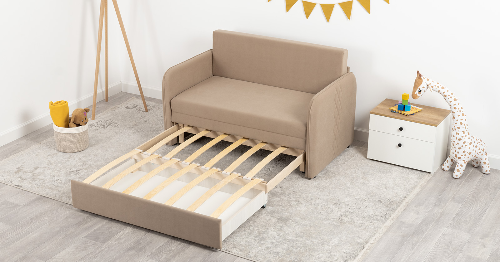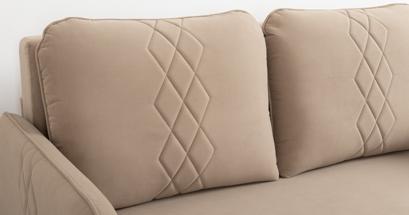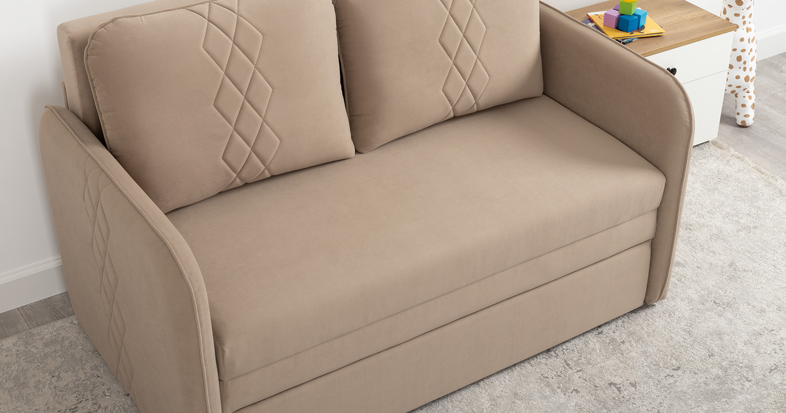 Стильный компактный диван для детской и гостиной. При своих скромных размерах он трансформируется в полноценное спальное место для детей и подростков. Лаконичный дизайн в виде декоративной стежки подчеркивает фактуру велюра, а небольшие размеры позволят разместить его в любом пространстве.