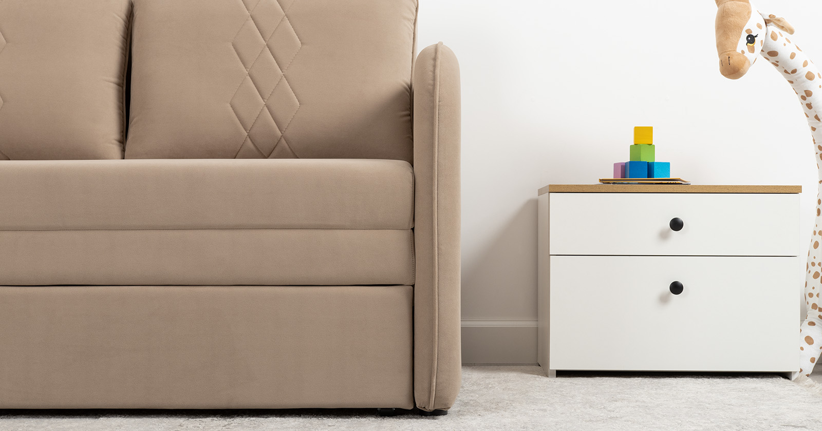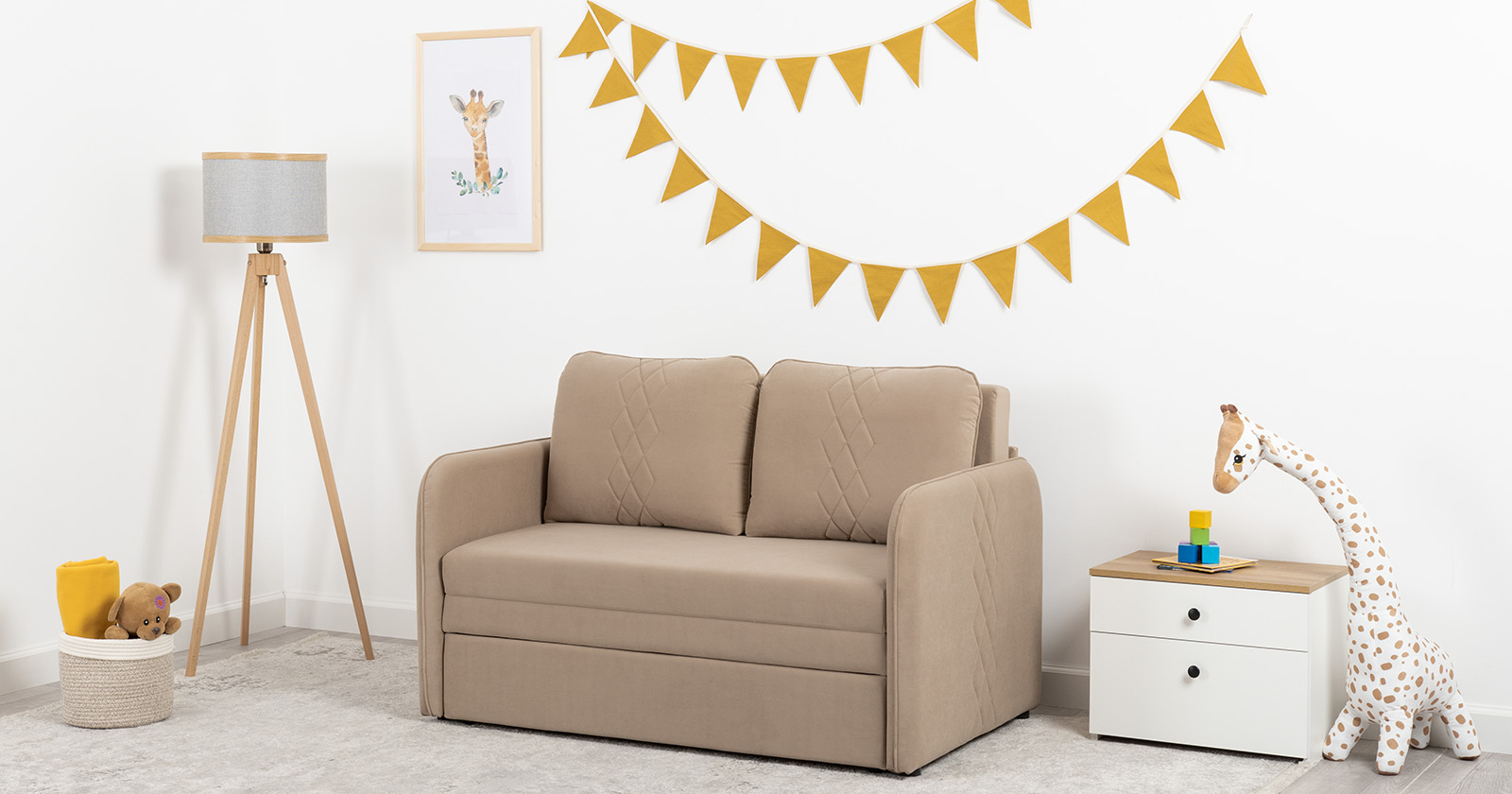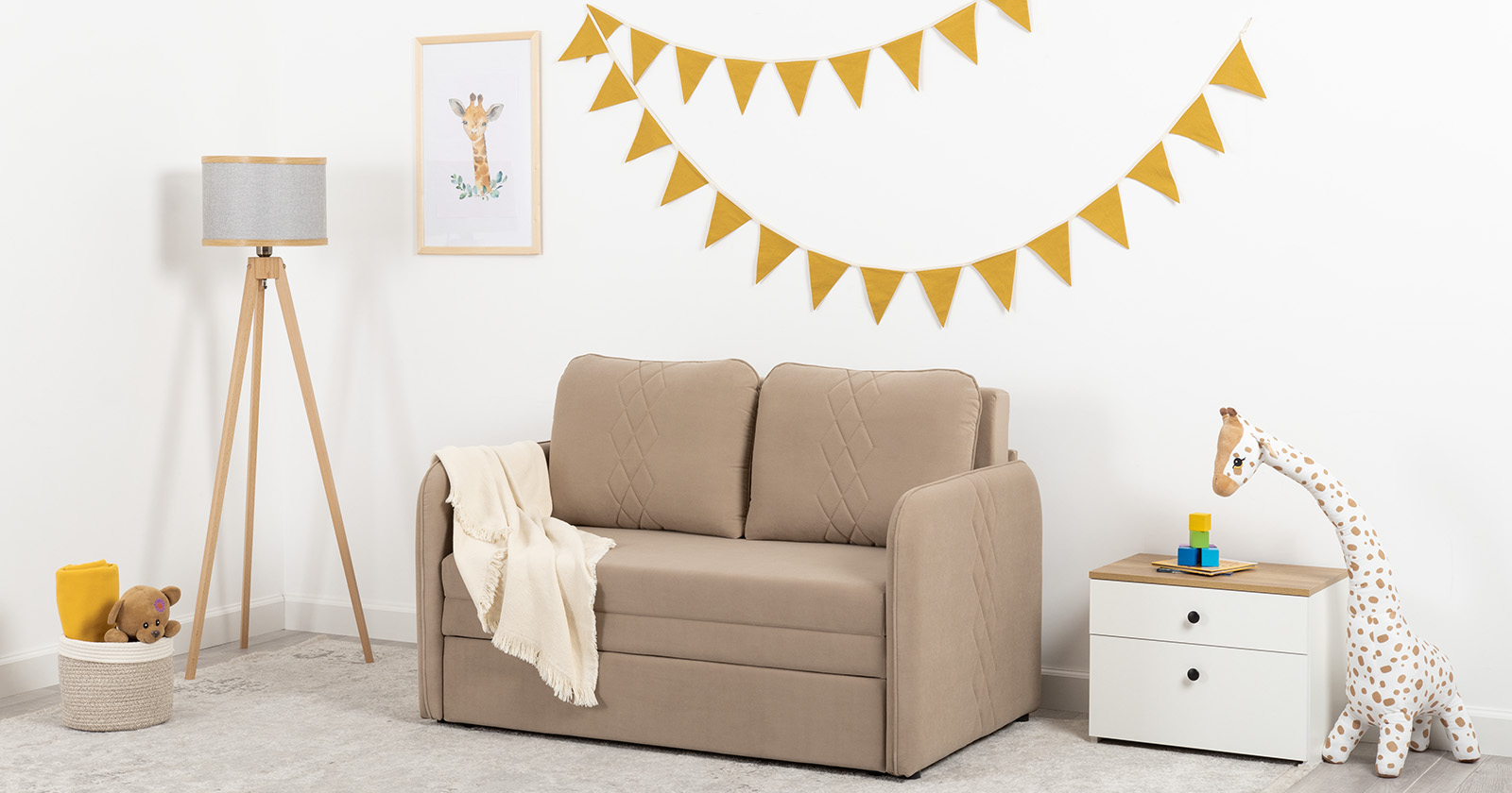 Стильный компактный диван для детской и гостиной. При своих скромных размерах он трансформируется в полноценное спальное место для детей и подростков. Лаконичный дизайн в виде декоративной стежки подчеркивает фактуру велюра, а небольшие размеры позволят разместить его в любом пространстве.
