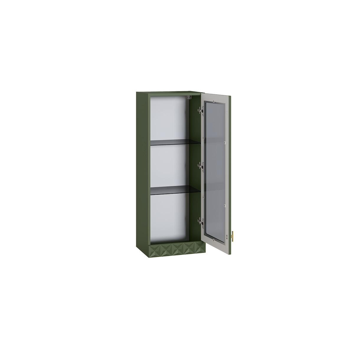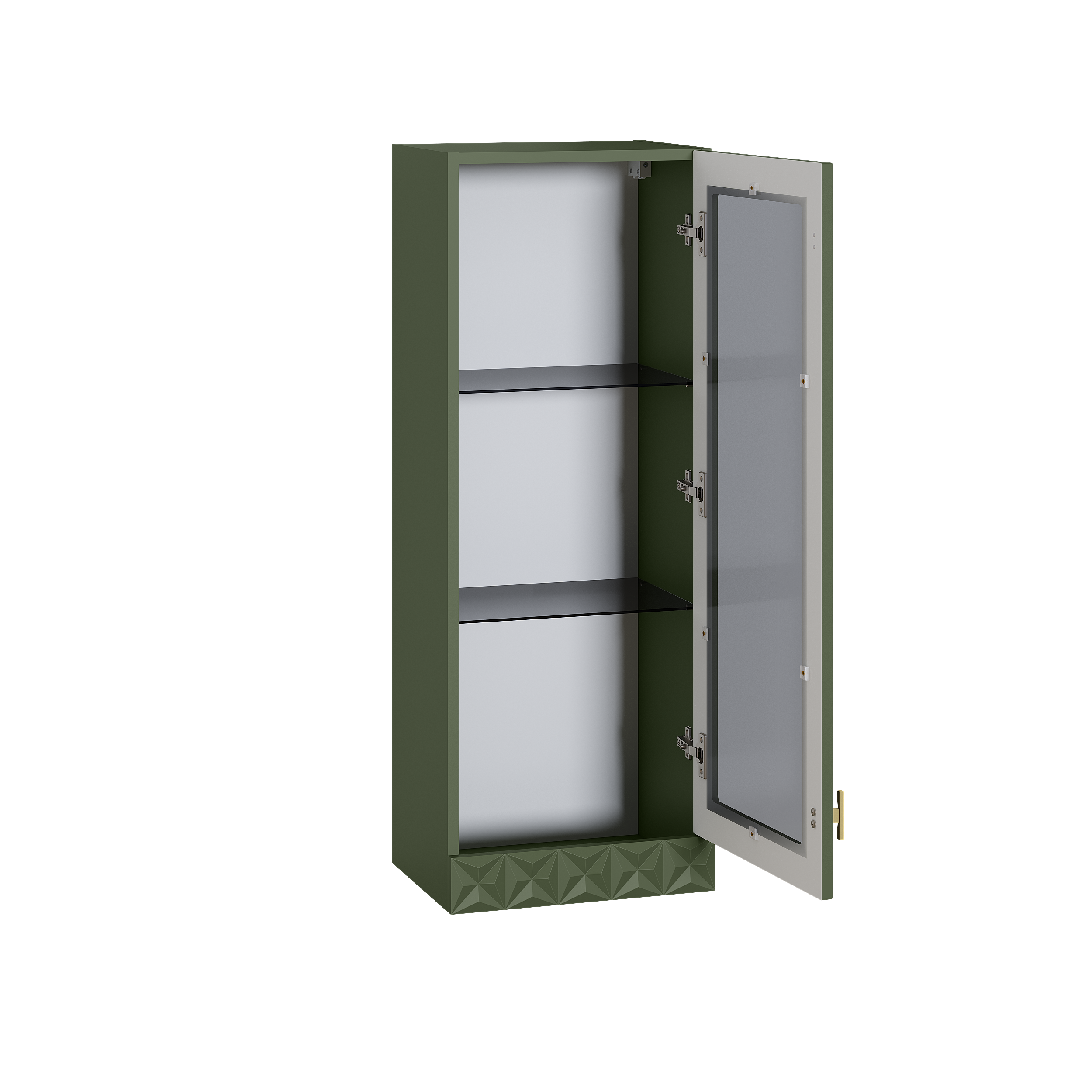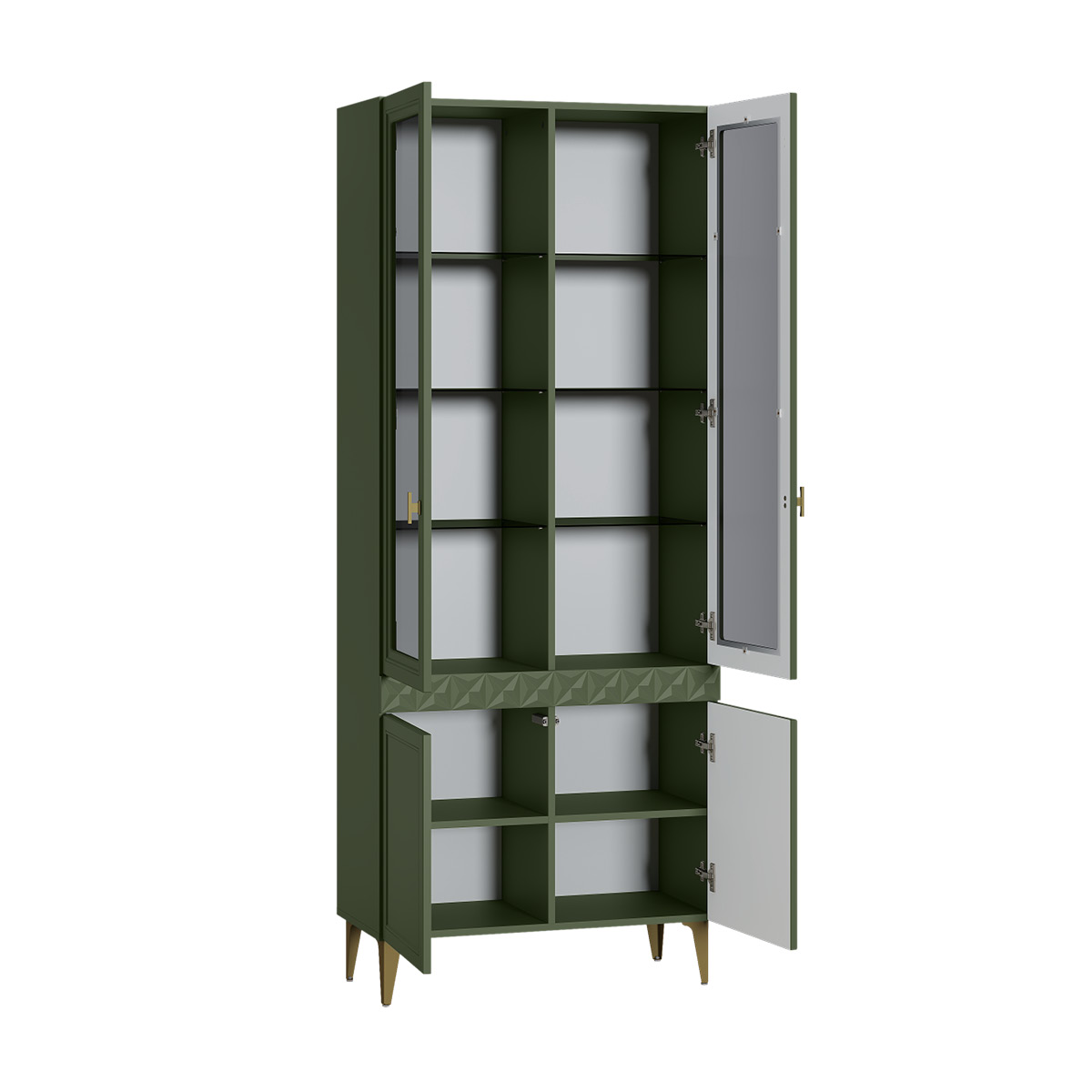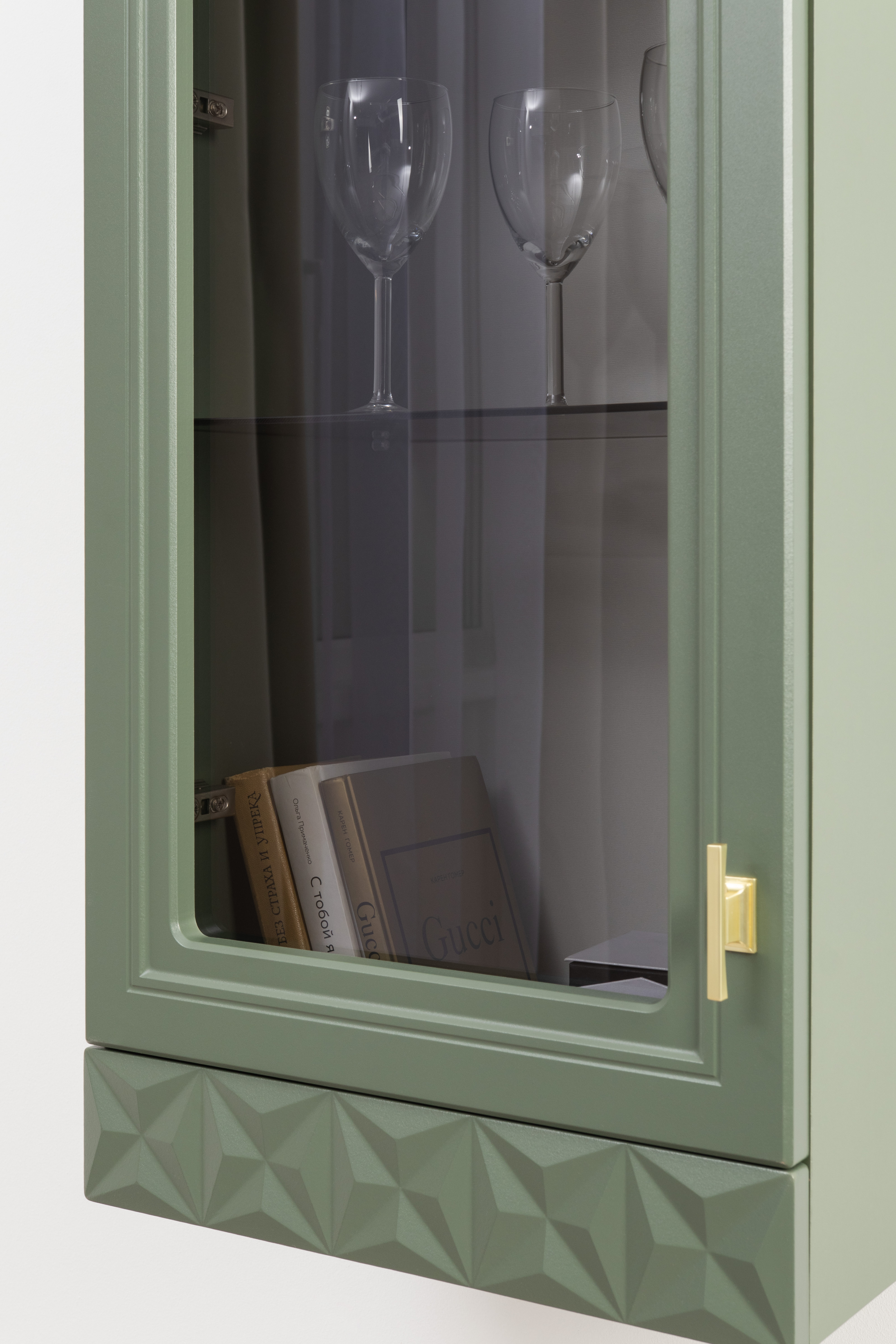 Изящные линии, глубокая фрезеровка фасадов из МДФ и благородные оттенки. Утончённая «Слоновая кость» и изысканная «Олива Шагрень» с глубоким зелёным тоном — создают атмосферу уюта, тепла и благородства. Металлические ручки и опоры золотого цвета придают мебели утончённый блеск, а петли и направляющие с доводчиками обеспечивают плавное и бесшумное закрытие фасадов.
