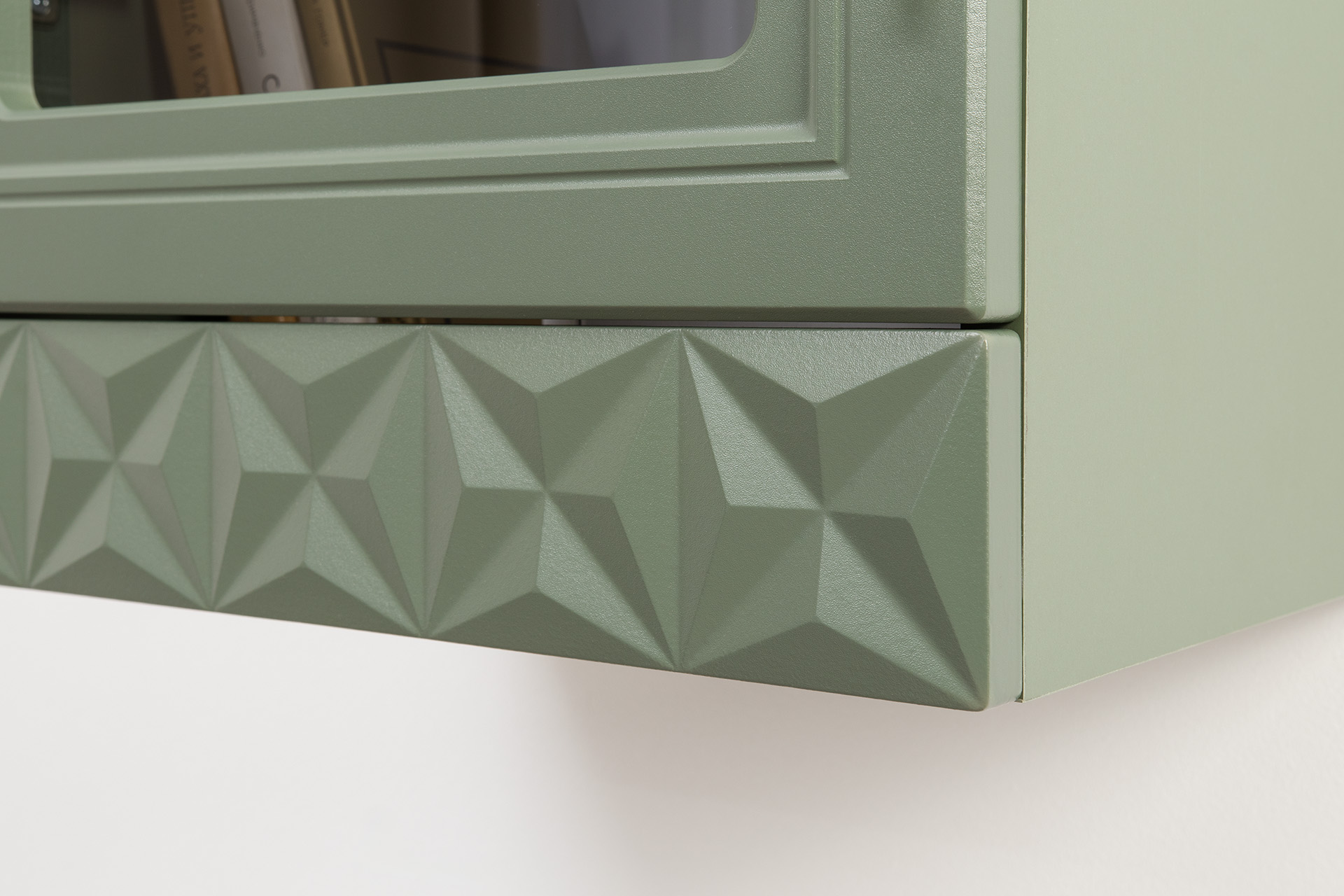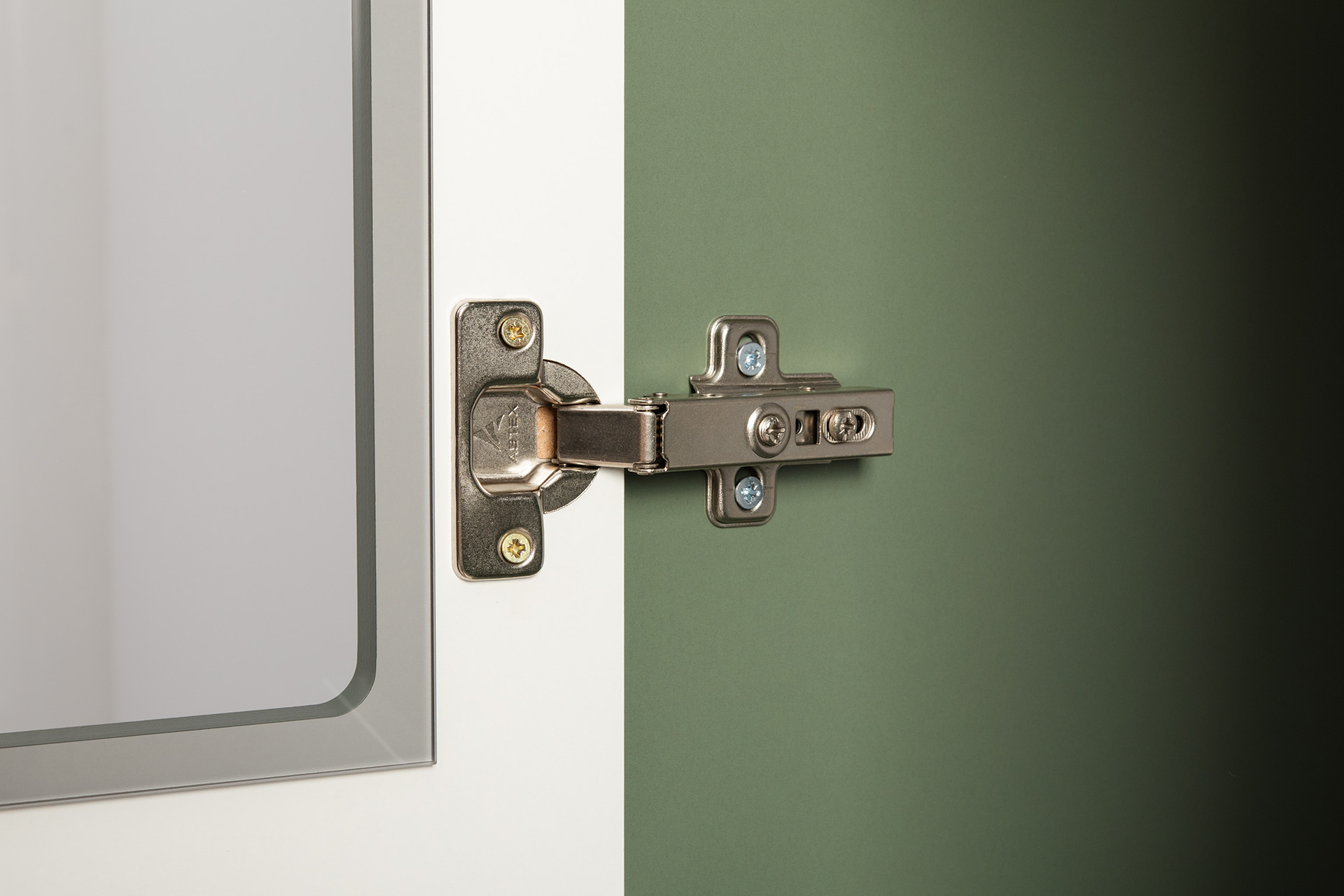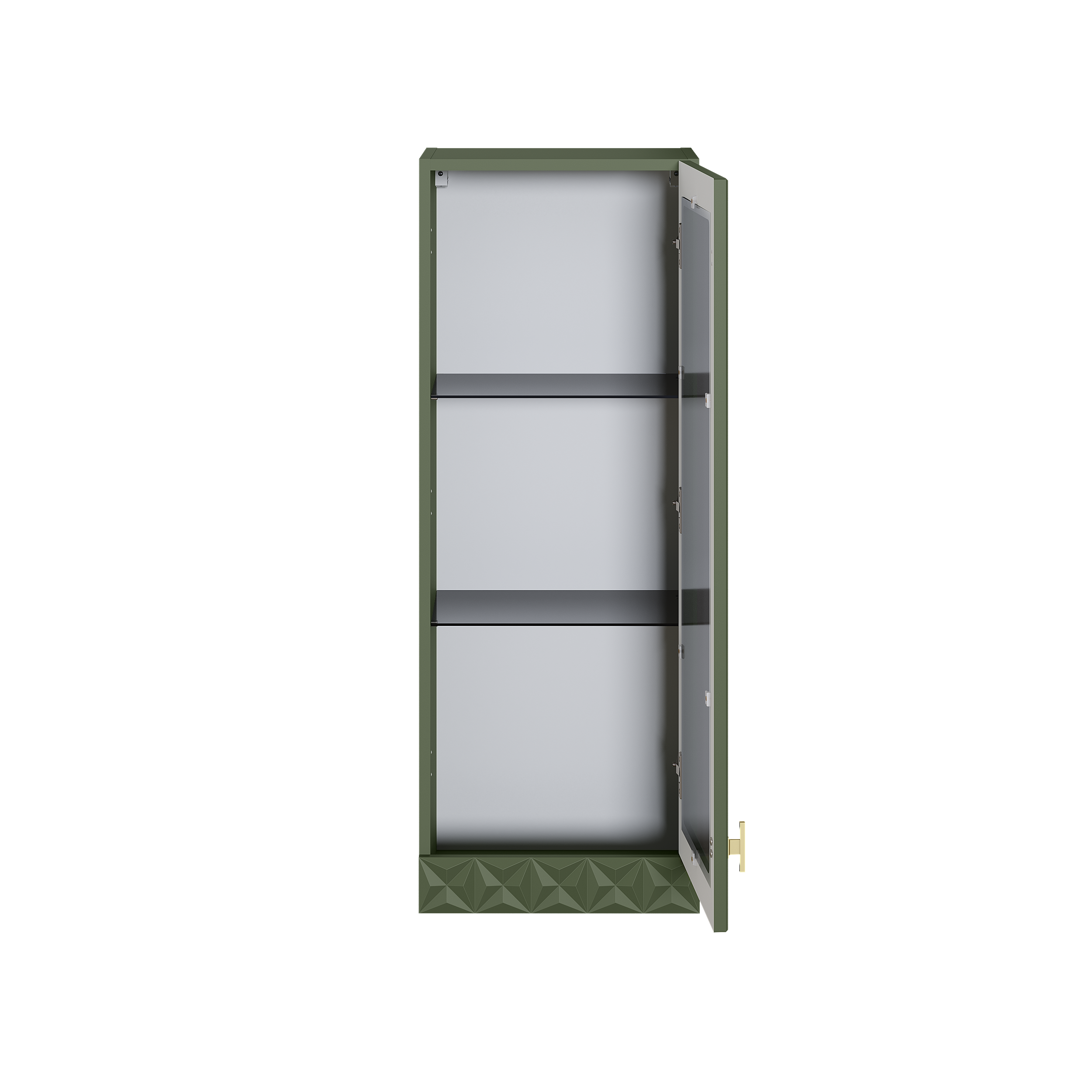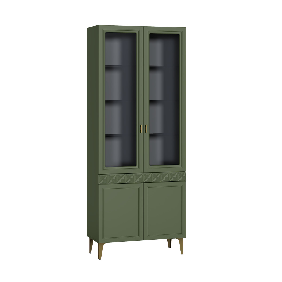 Изящные линии, глубокая фрезеровка фасадов из МДФ и благородные оттенки. Утончённая «Слоновая кость» и изысканная «Олива Шагрень» с глубоким зелёным тоном — создают атмосферу уюта, тепла и благородства. Металлические ручки и опоры золотого цвета придают мебели утончённый блеск, а петли и направляющие с доводчиками обеспечивают плавное и бесшумное закрытие фасадов.