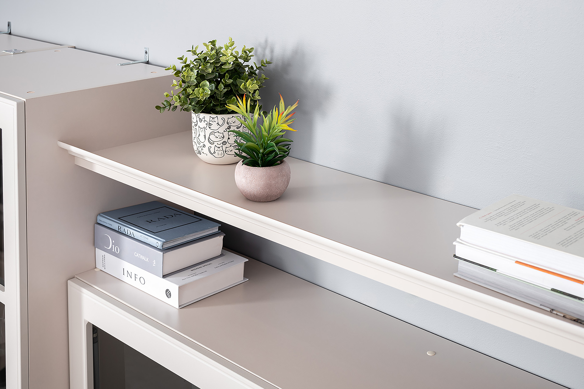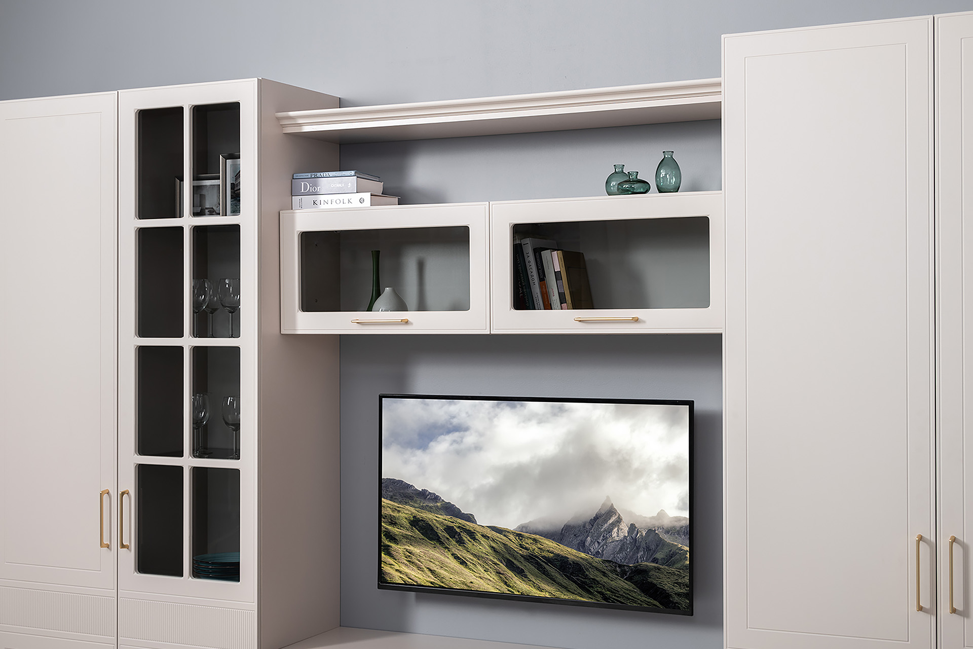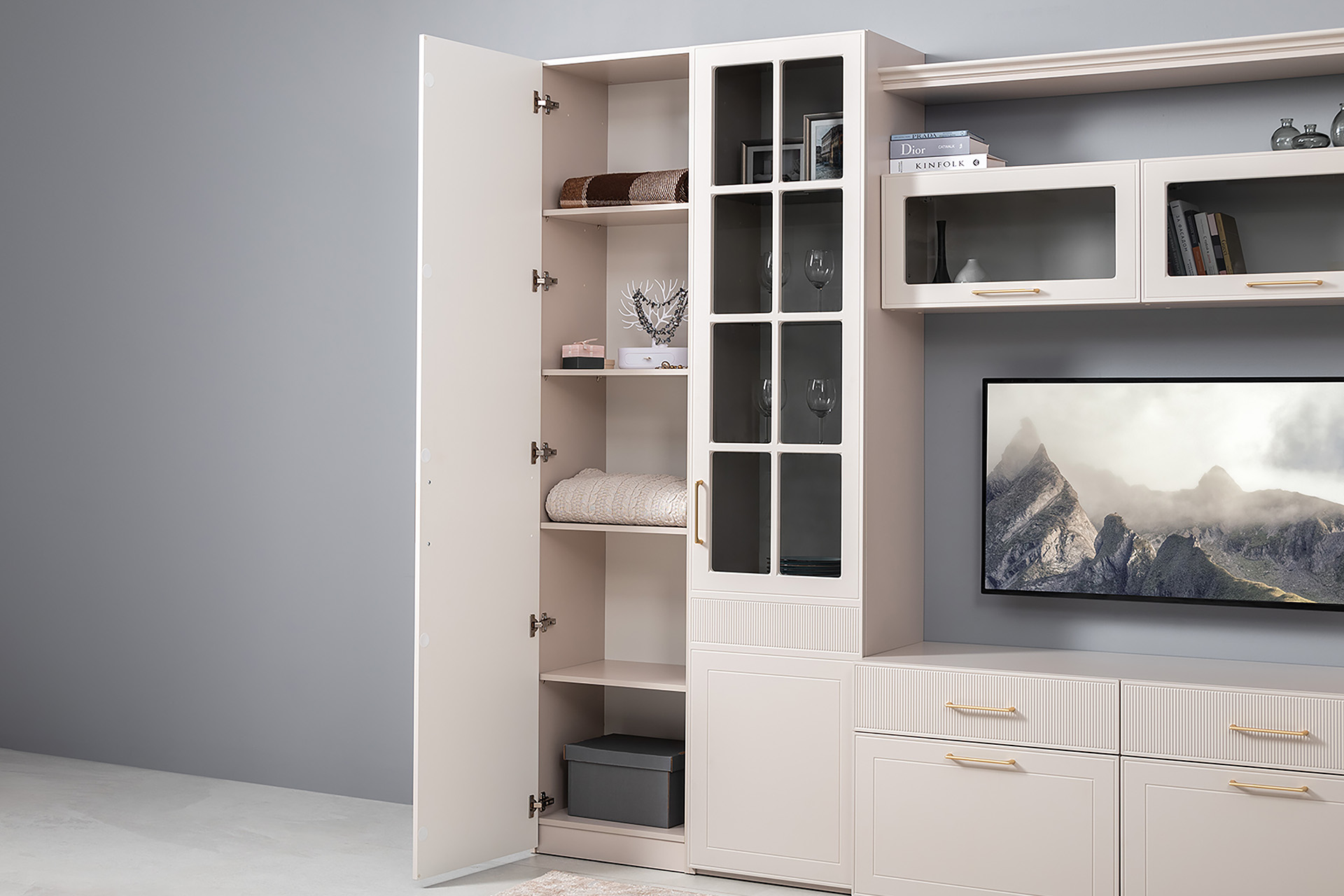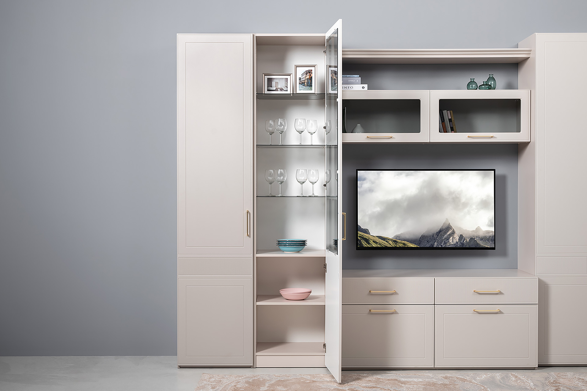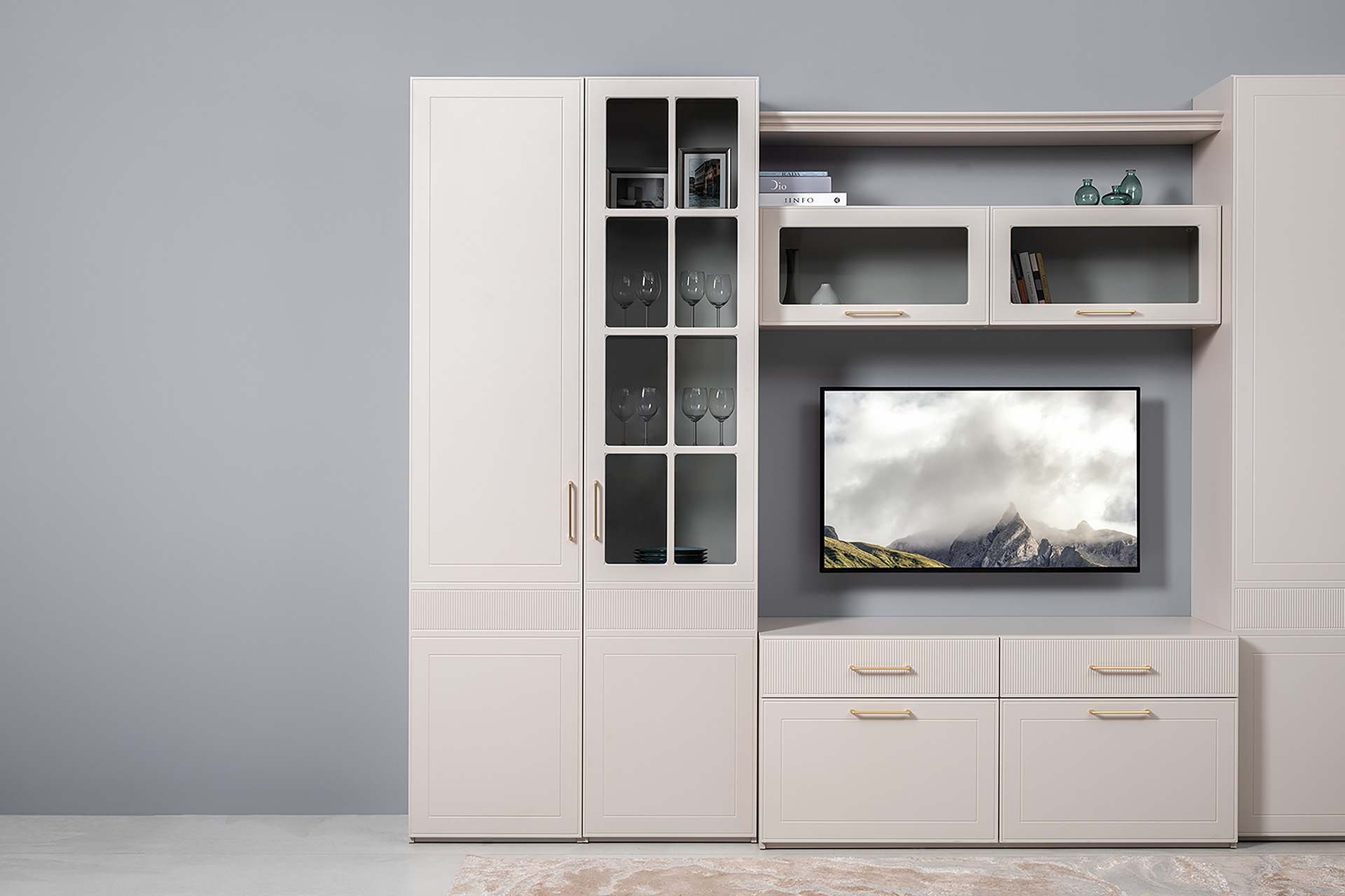 Гостиная Ричфорд композиция 1 с карнизами, кашемир 5981 BS, моно керамика D166-2 ПВХ, белый PE шагрень (собирается на любую сторону)