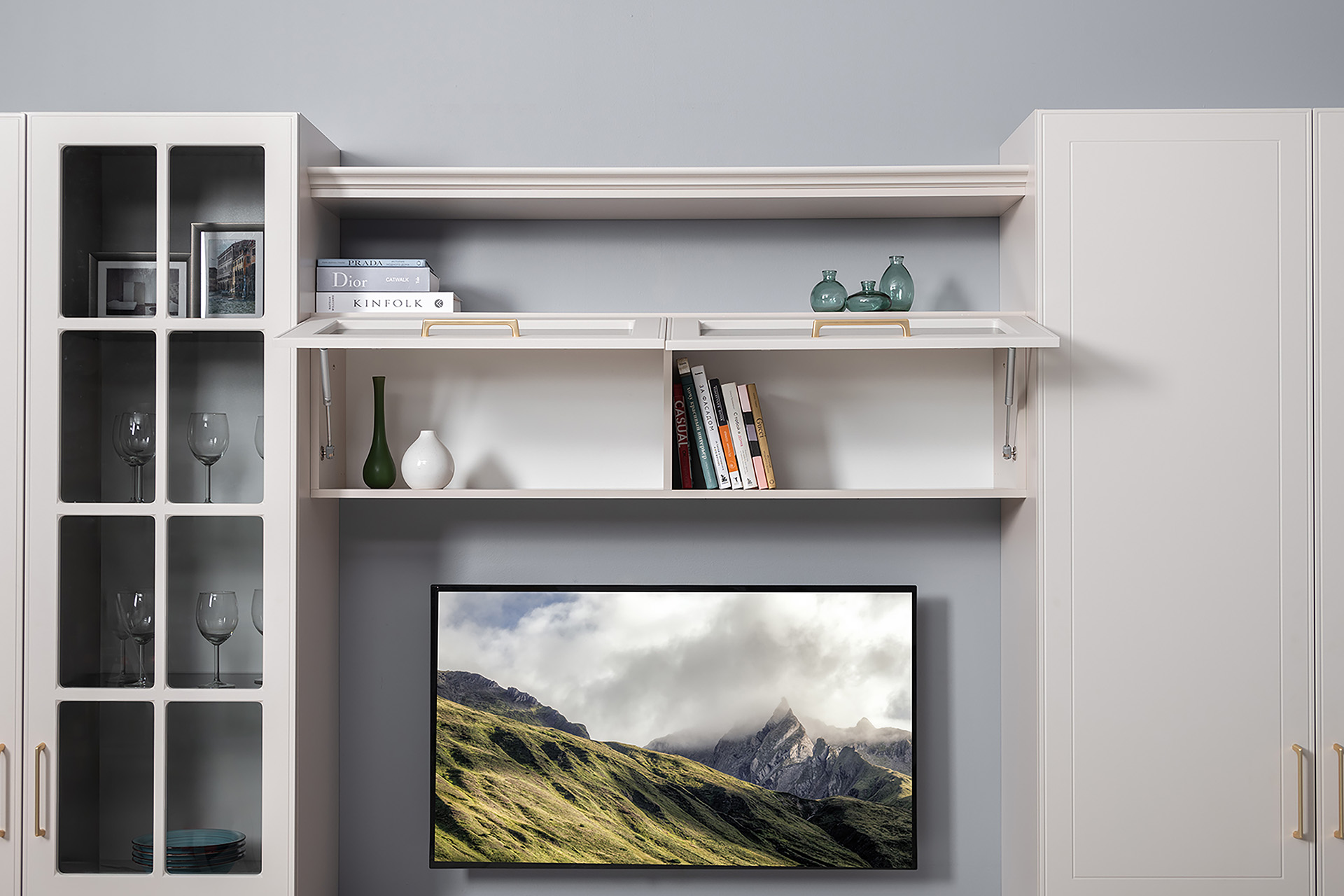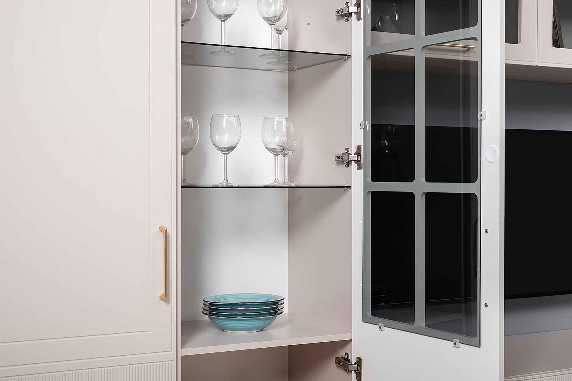 Фрезерованные фасады из МДФ, металлические ручки и витрины с тонированным стеклом создают изысканный образ.