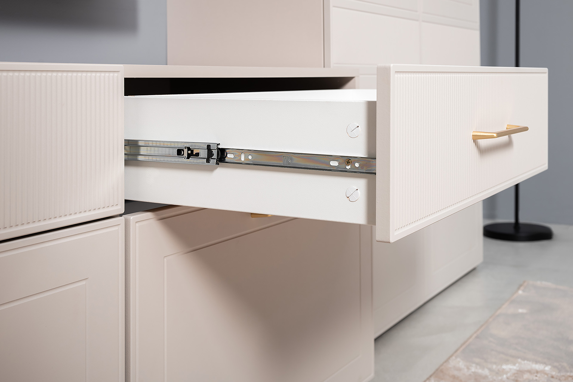 Петли с доводчиками, полное выдвижение ящиков, выдвижная штанга в шкафу для одежды и съемные полки делают использование максимально комфортным.