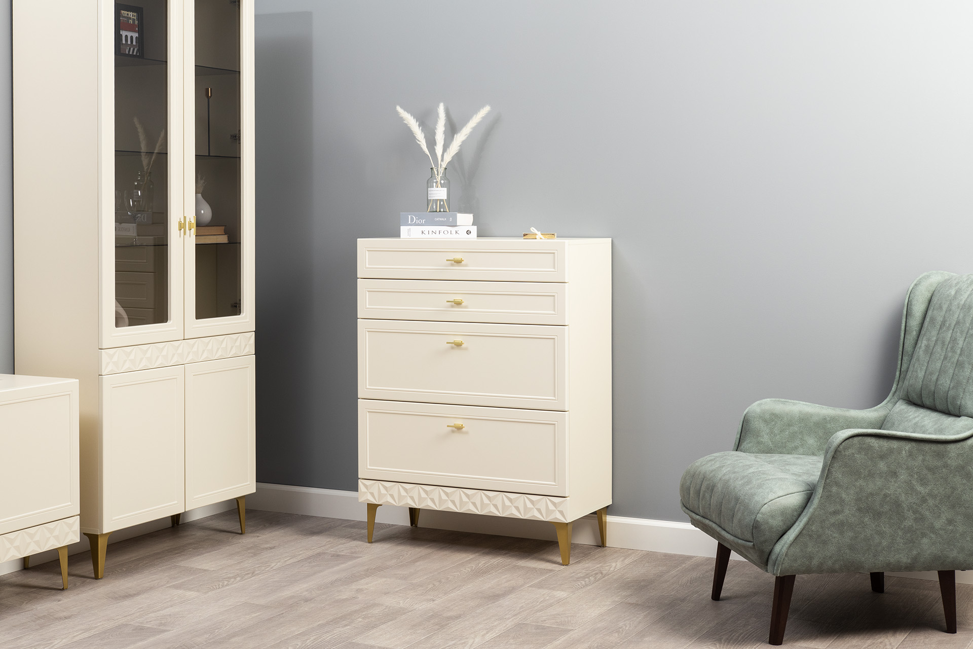 Комод Марион 16.249 дымчатый зеленый K521, олива шагрень AG 1050 ПВХ, белый PE шагрень