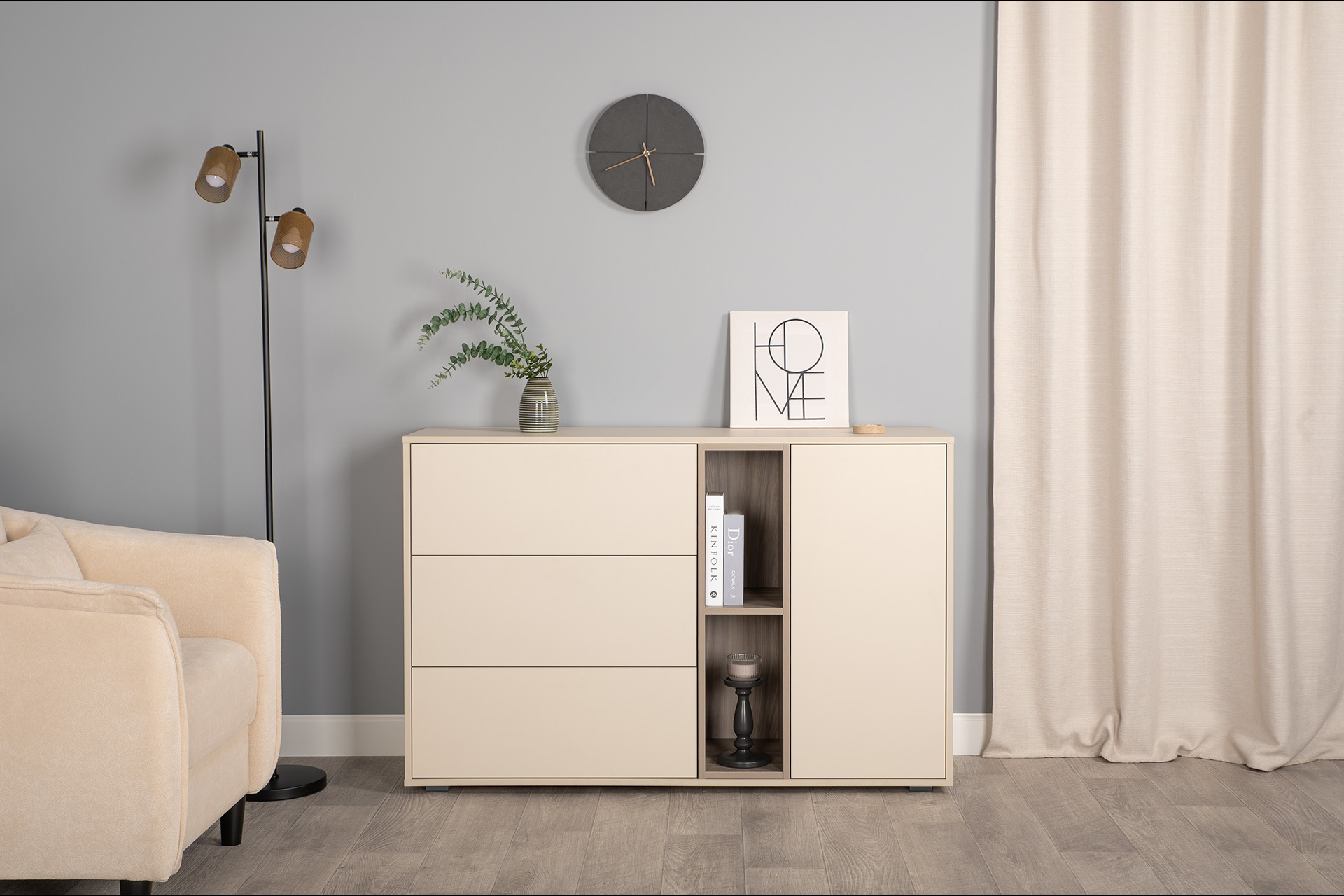 Благодаря нейтральному светлому оттенку и универсальности декора модули можно разместить в спальне, гостиной, прихожей.