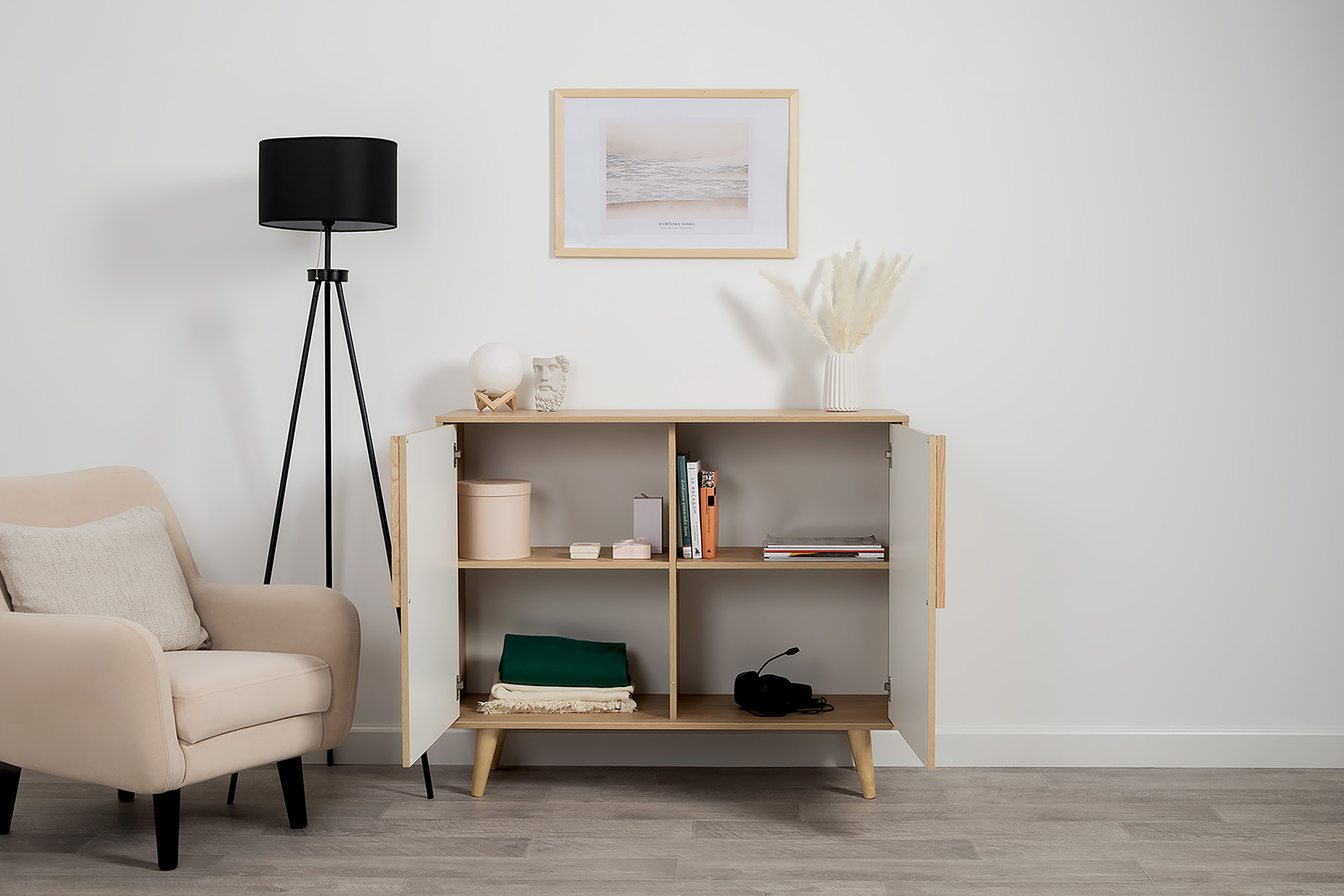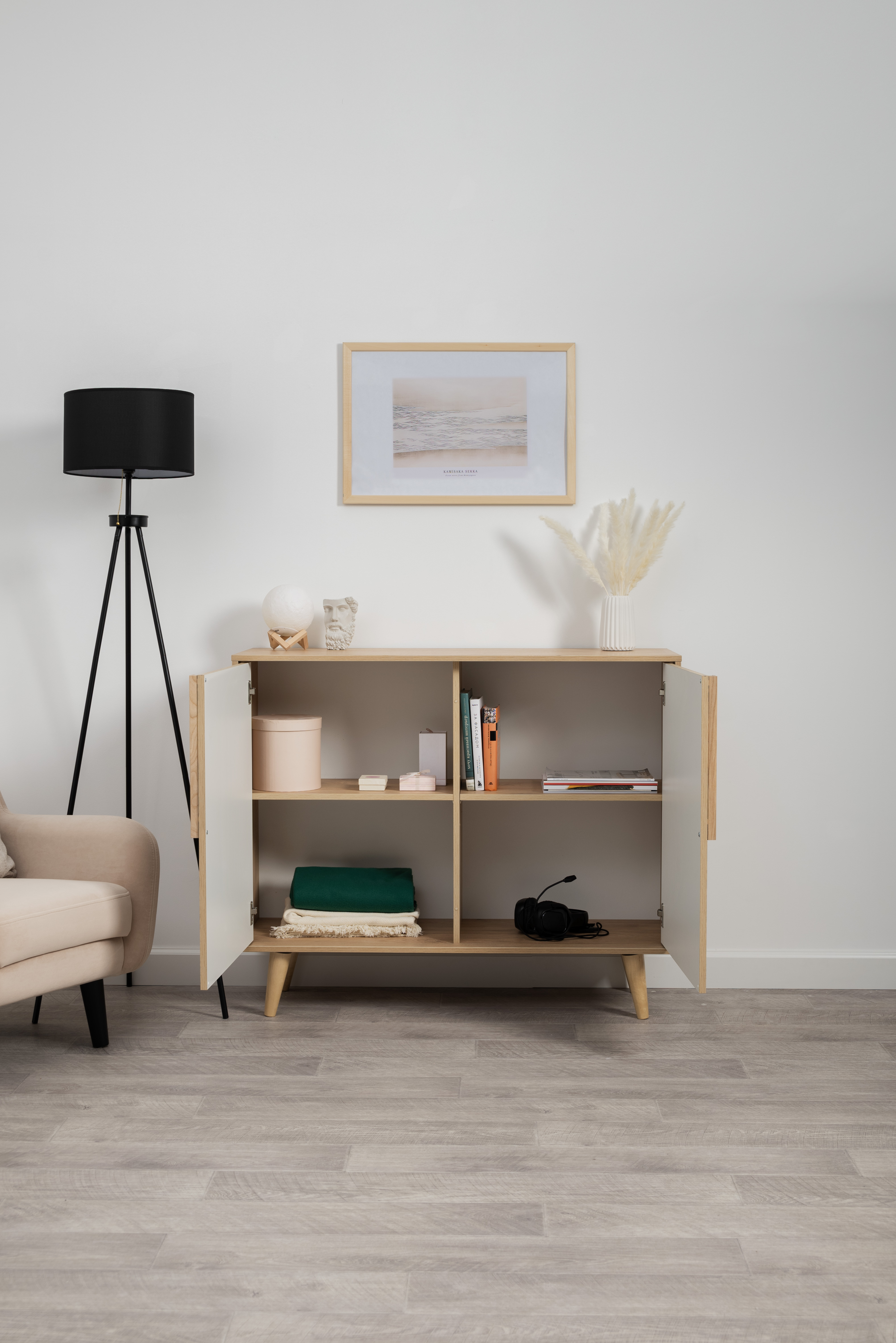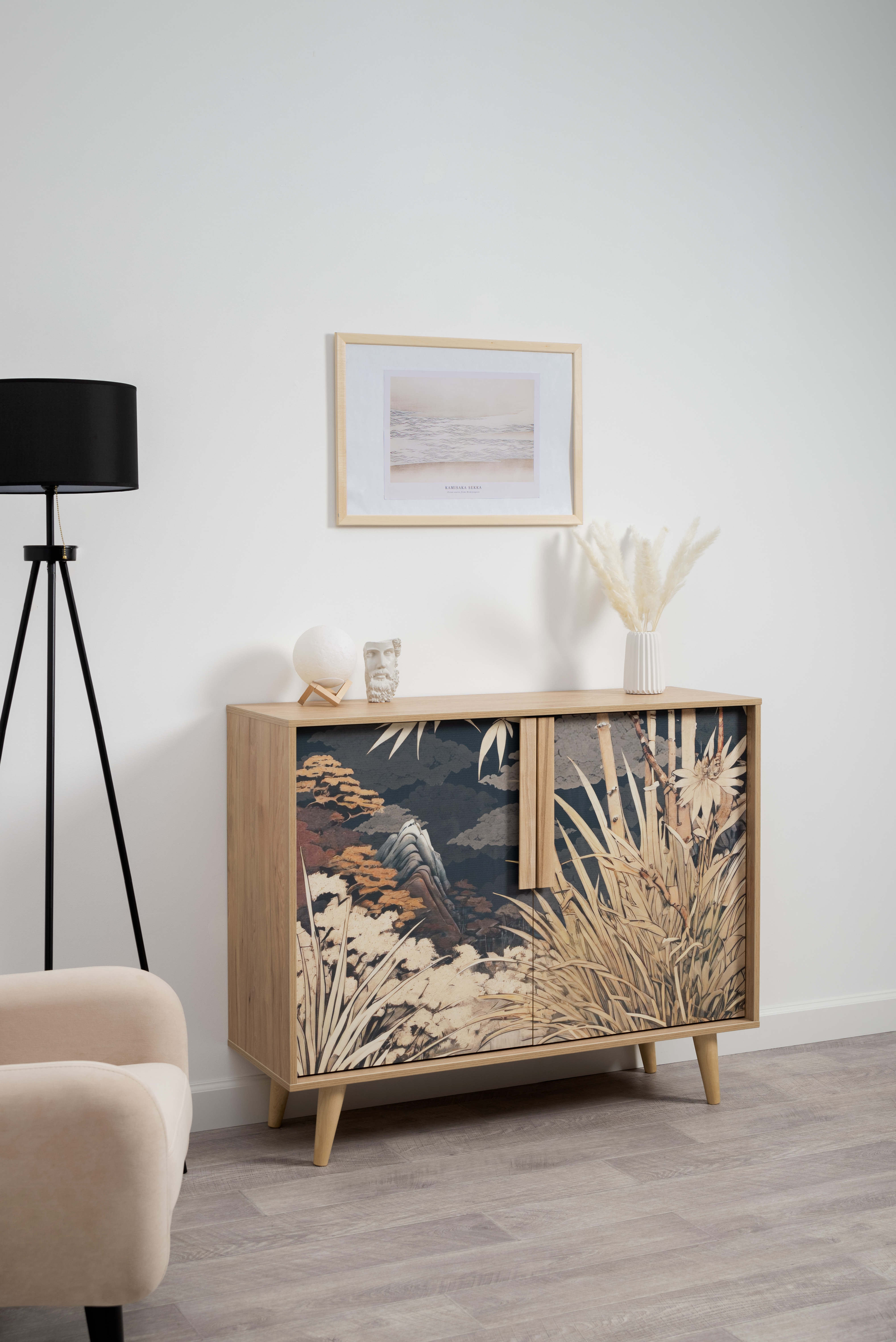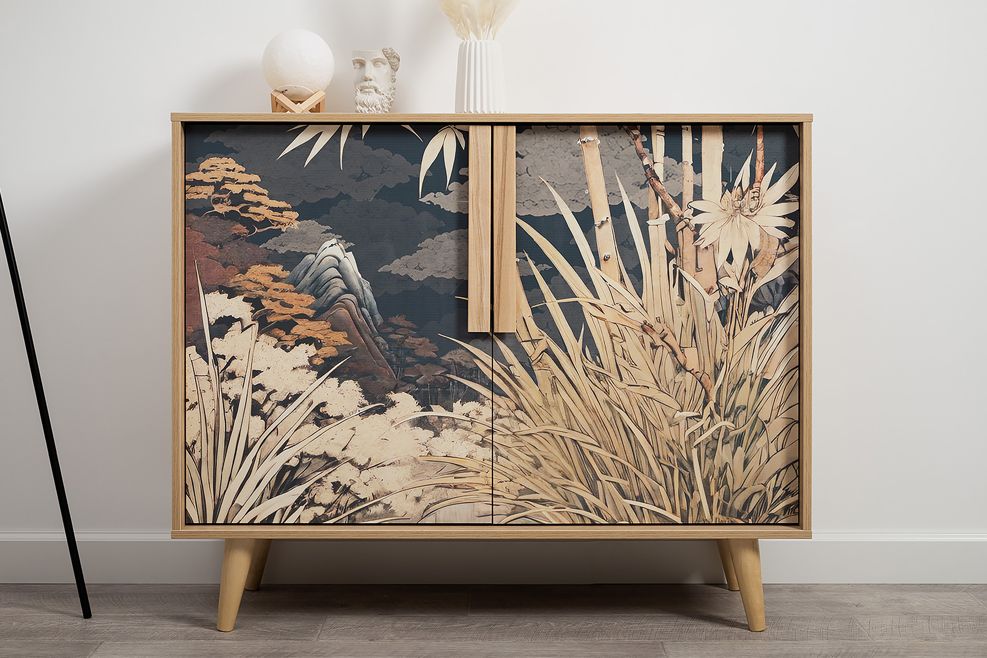 Комод Току 16.230.04 украшают фасады с фотопечатью в восточном стиле, и дополняют ручки и опоры из массива дерева. Вместительные отделения со съемными регулируемыми полками обеспечивают удобное хранение, а углубленные фасады придают конструкции стильную глубину.