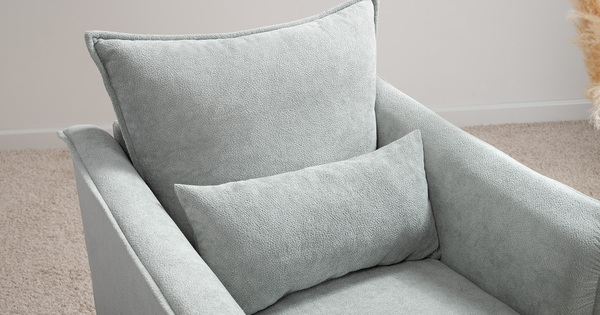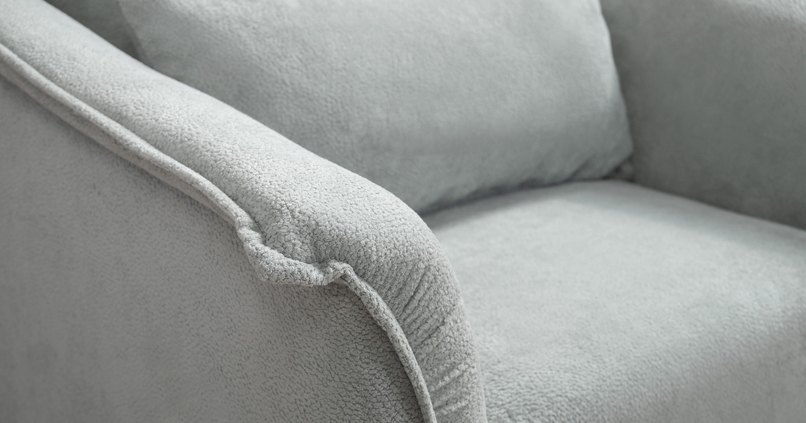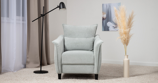 Кресло с приспинной подушкой трапецивидной формы на молнии, по трем сторонам которой проложена отделочная строчка на 1,2 см. По контуру боковин проложен декоративный кант на 1,2 см основной ткани. Кант проходит по центру передней части боковины, а по внутренней верхней части сборка.