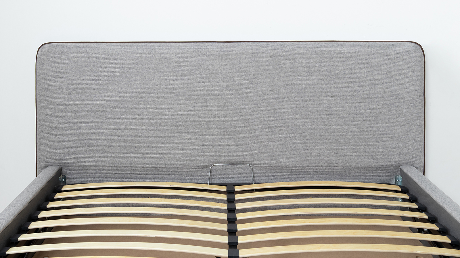 Основание кровати укомплектовано матрасодержателями. Жесткое кроватное дно из МДФ 6 мм. Задняя стенка изголовья выполнена в тех. ткани (спанбонд).
