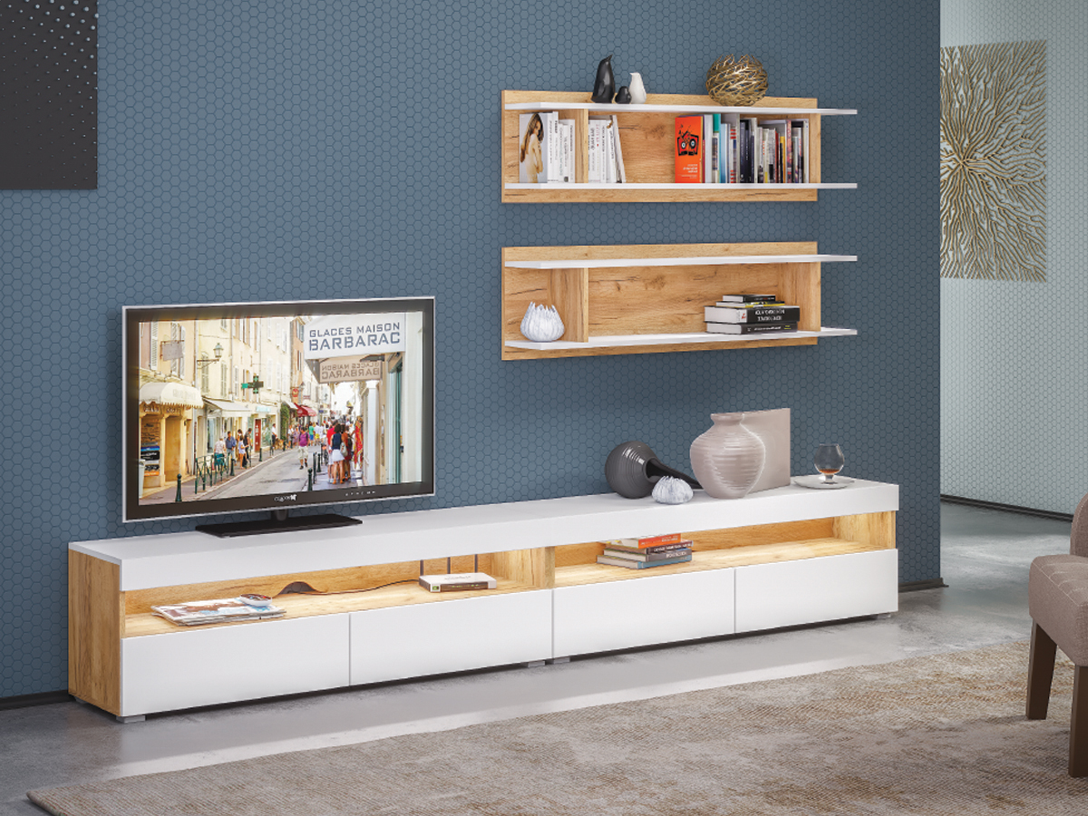 Тумбы под ТВ может быть укомплектована подсветкой, которая эффектно смотрится в интерьере и подчёркивает широкую нишу, свободную от перегородок.
