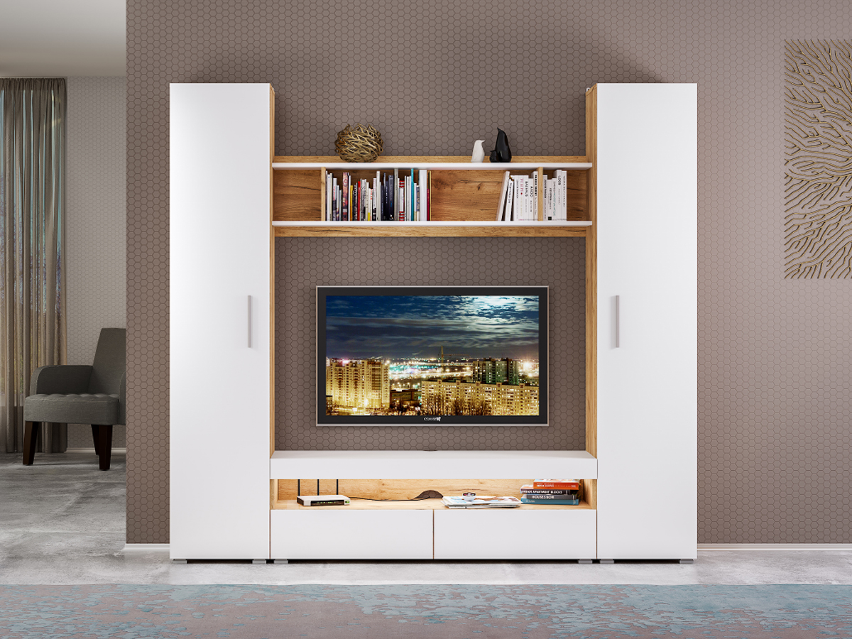 Тумба под ТВ в гостиную Альба дуб золотой CRAFT, белый премиум, без подсветки