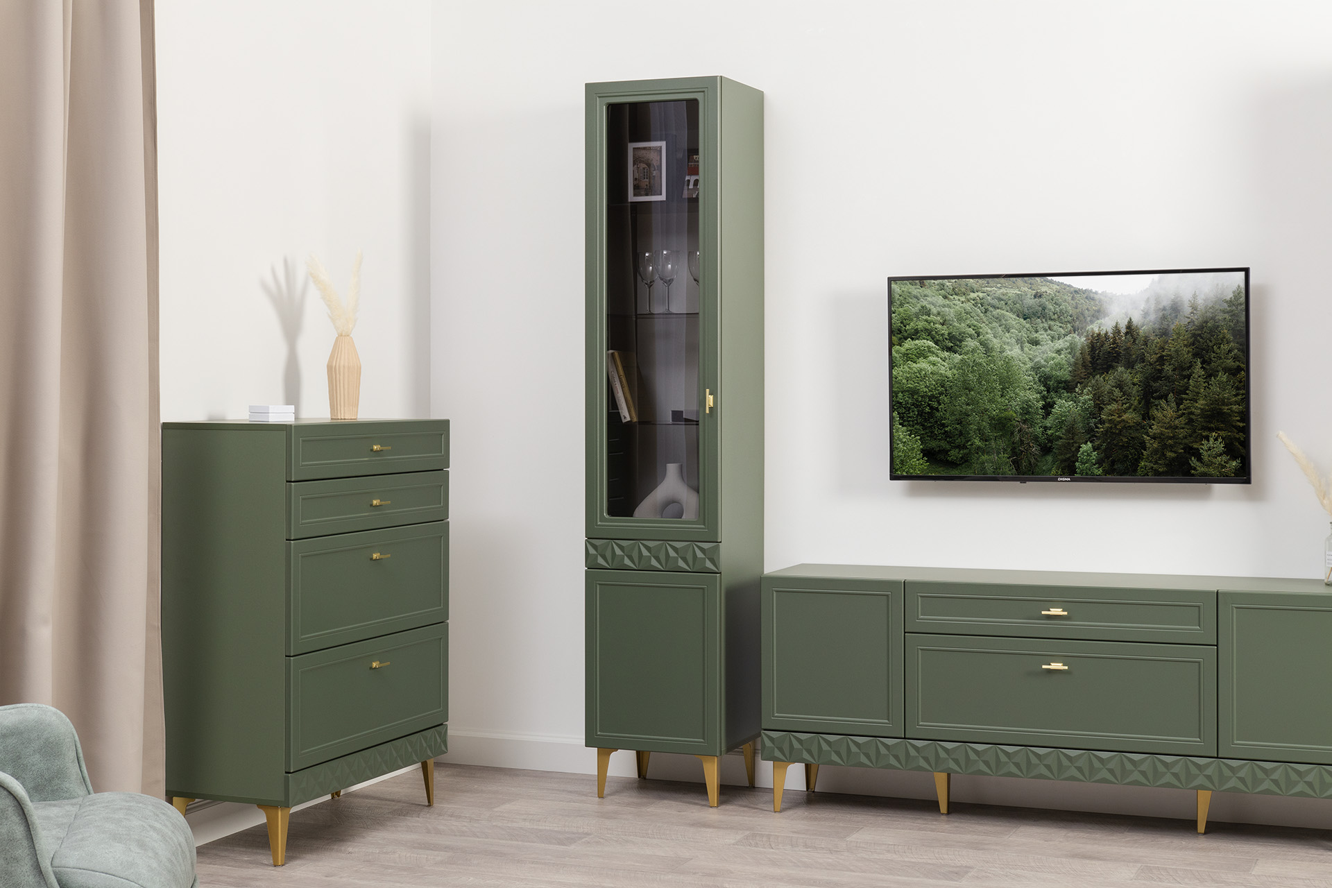 Изящные линии, глубокая фрезеровка фасадов из МДФ и благородные оттенки. Утончённая «Слоновая кость» и изысканная «Олива Шагрень» с глубоким зелёным тоном — создают атмосферу уюта, тепла и благородства. Металлические ручки и опоры золотого цвета придают мебели утончённый блеск, а петли и направляющие с доводчиками обеспечивают плавное и бесшумное закрытие фасадов.
