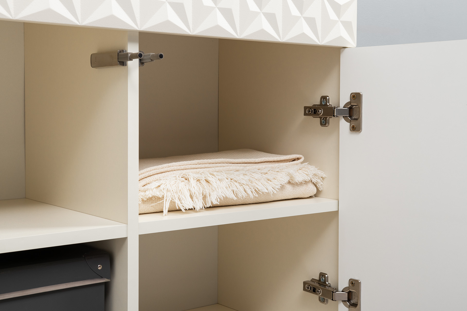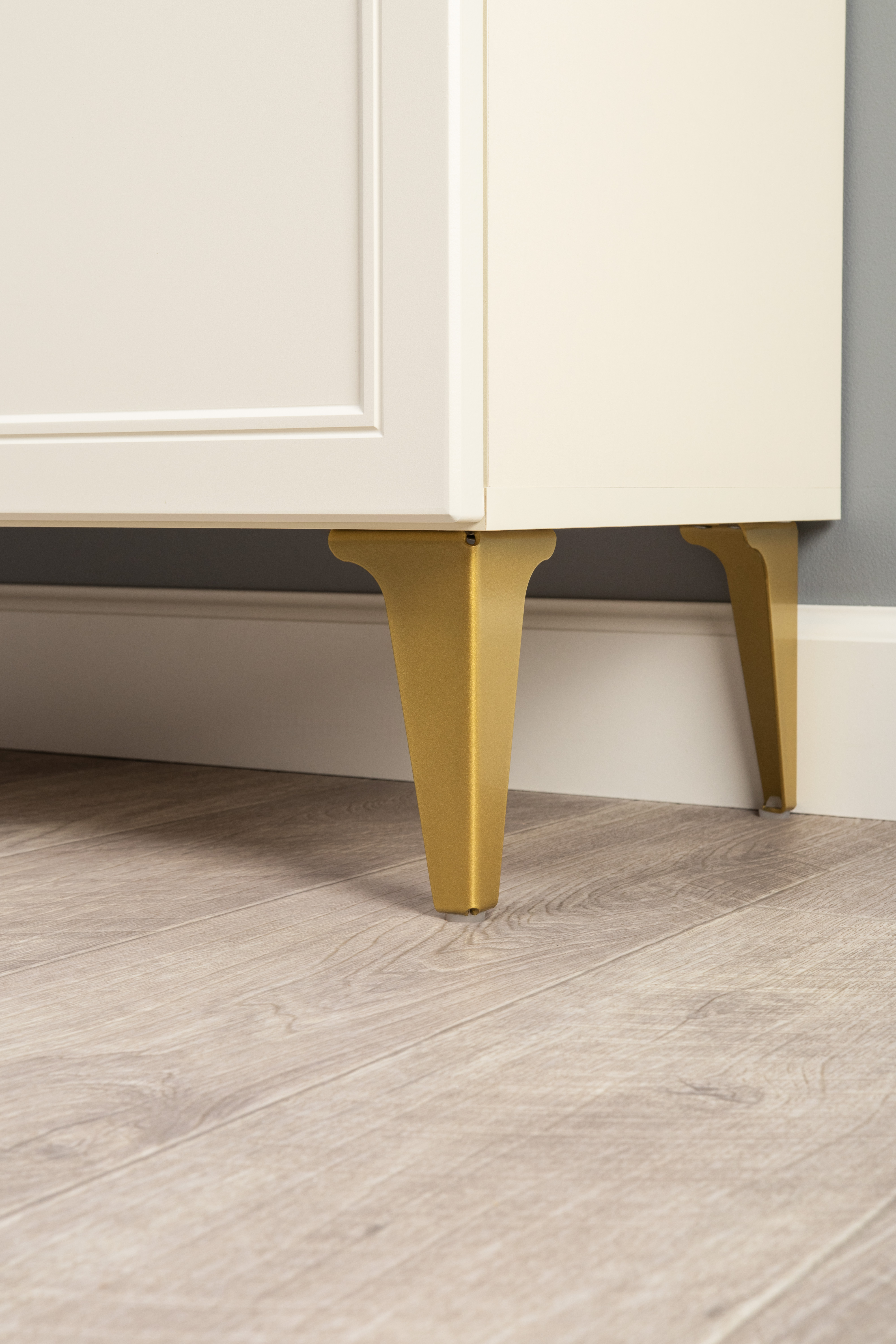 Изящные линии, глубокая фрезеровка фасадов из МДФ и благородные оттенки. Утончённая «Слоновая кость» и изысканная «Олива Шагрень» с глубоким зелёным тоном — создают атмосферу уюта, тепла и благородства. Металлические ручки и опоры золотого цвета придают мебели утончённый блеск, а петли и направляющие с доводчиками обеспечивают плавное и бесшумное закрытие фасадов.