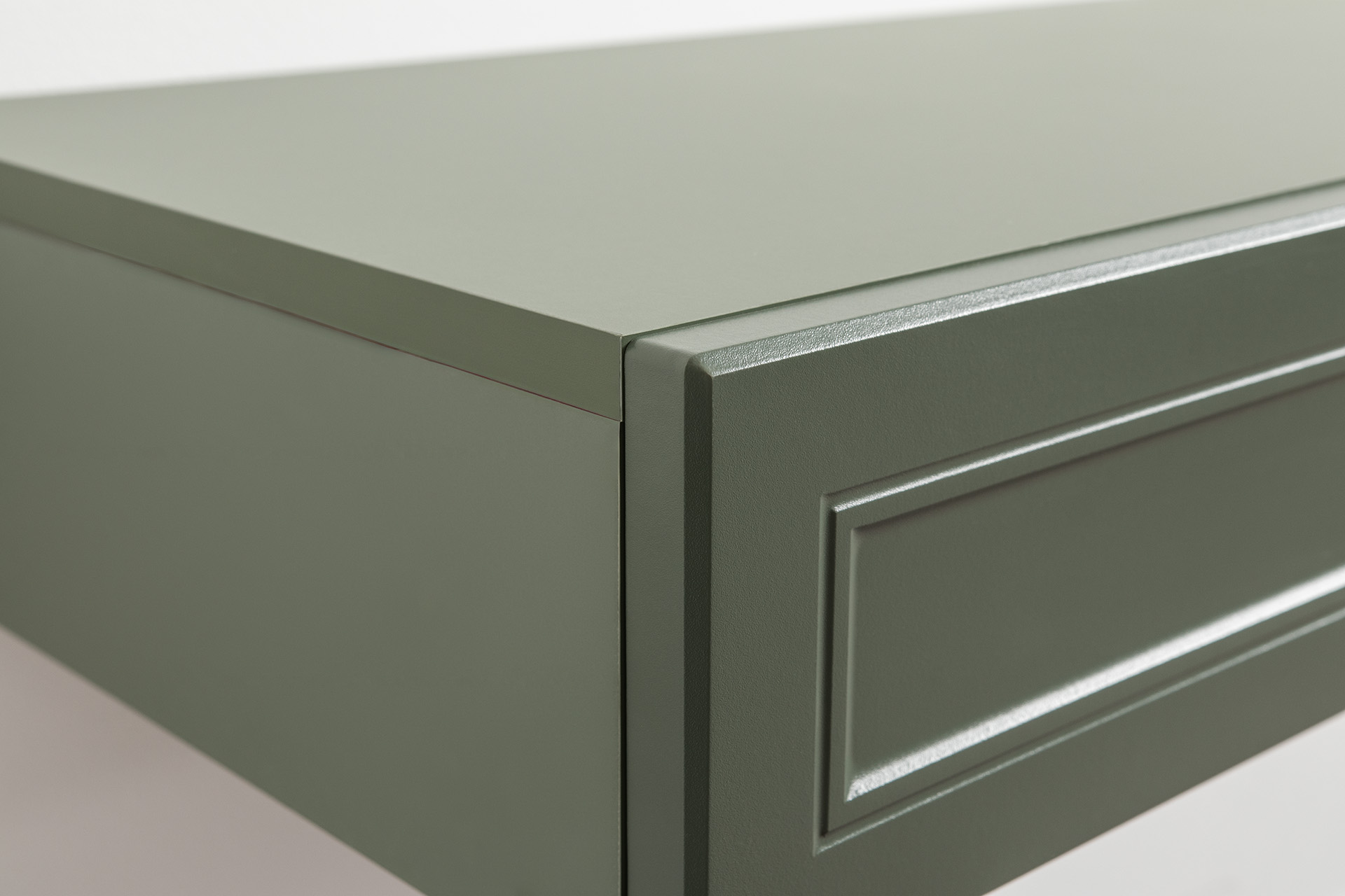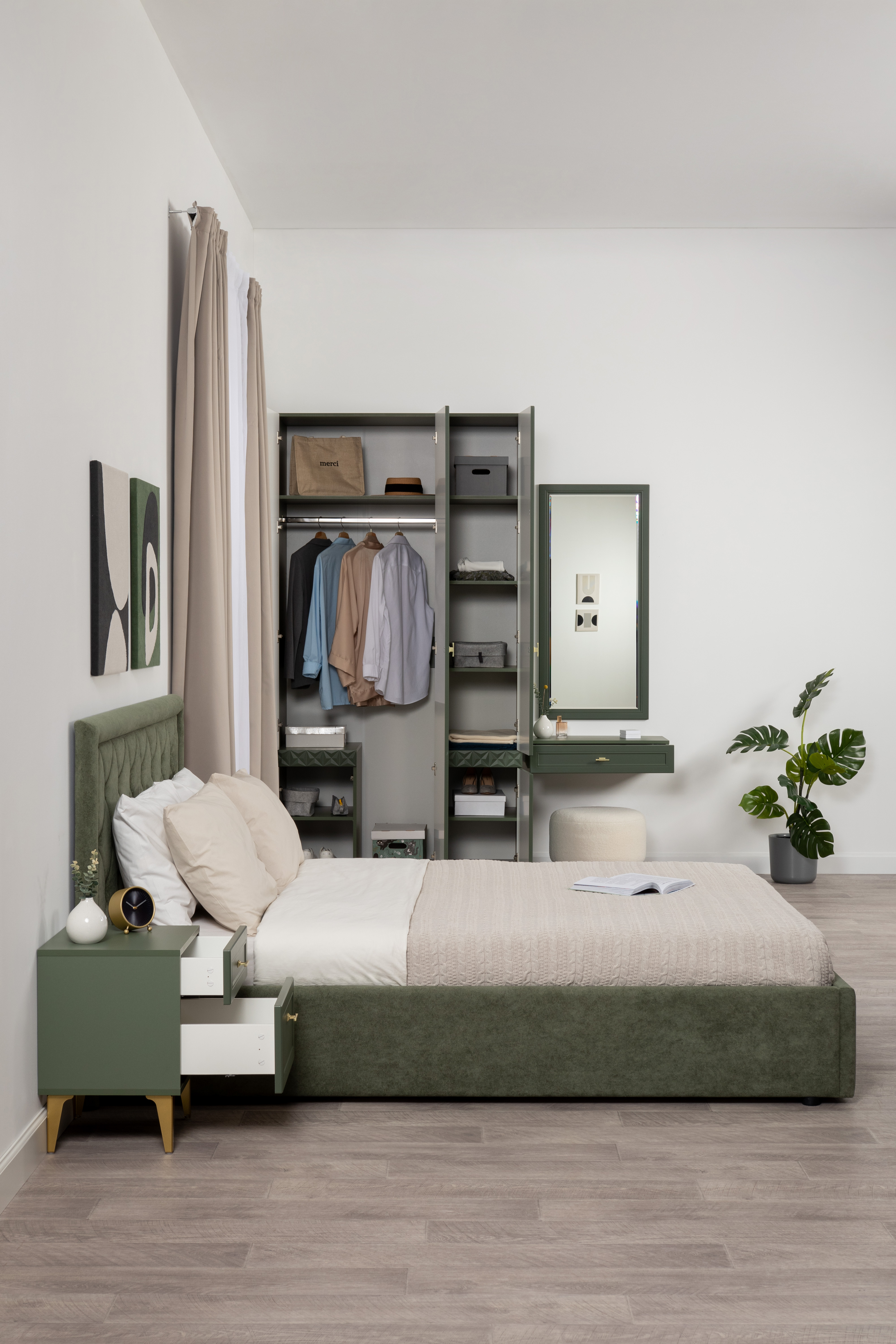 Изящные линии, глубокая фрезеровка фасадов из МДФ и благородные оттенки. Утончённая «Слоновая кость» и изысканная «Олива Шагрень» с глубоким зелёным тоном — создают атмосферу уюта, тепла и благородства. Металлические ручки и опоры золотого цвета придают мебели утончённый блеск, а петли и направляющие с доводчиками обеспечивают плавное и бесшумное закрытие фасадов.